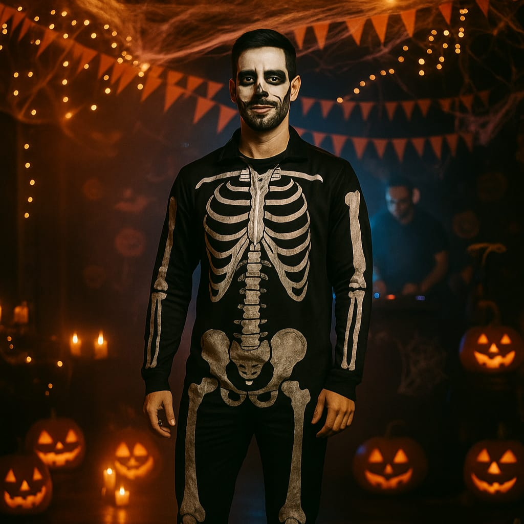 Create a theatrical Halloween track blending Acid Jazz, Dark Cabaret, Nu-Disco, Breakbeat, and Horrorcore, energetic, spooky, cinematic, and playful, Use electric Rhodes piano, walking bass, swing drums, brass stabs, dramatic piano/accordion sounds, fast danceable synths, frenetic breakbeat drums, dark horror effects, laughter, and tension layers, Structure should include intro with suspenseful pads and ghostly whispers, verses with narrative swing, pre-choruses with rising tension and brass stabs, choruses with catchy theatrical melodies and ghostly backing vocals, bridge with countdown and rapid vocals, final cinematic chorus with full energy, and outro with echoing laughter and suspenseful pads, Vocals should alternate spoken narration and singing, with ghostly choruses, playful horror tones, and urgent dramatic phrasing, cheerful and young happy male voice