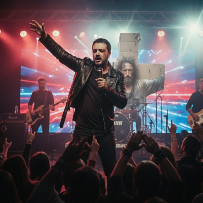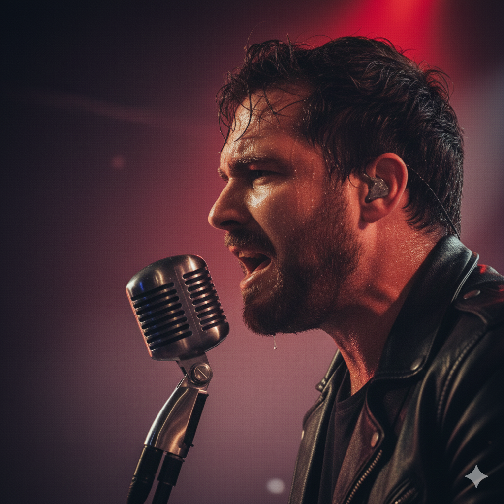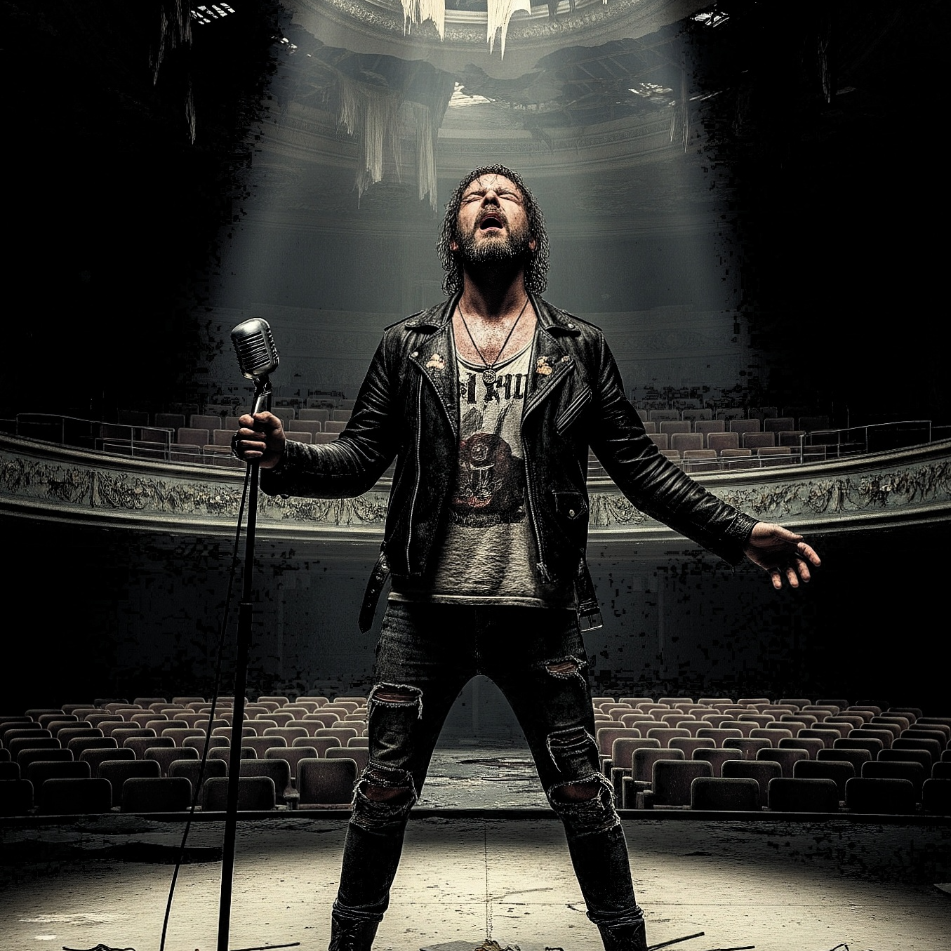 Concierto en directo, voz rasgada y emocional masculina en español, tono melancólico y dramático, estilo Robe Iniesta, balada rock intensa, Inicio con guitarra española en arpegio lento, acompañada por violín desgarrado y fondo de murmullos de público, Interpretación vocal muy expresiva, con susurros, gritos y segundos coros en eco tenue (segunda voz), distorsión suave en el coro, batería entra con fuerza controlada, Ambientes de sala pequeña con reverberación natural, Voces principales profundas y poéticas, letra filosófica y emocional, mezcla de ternura y rabia, Gritos desgarrados en el estribillo, respiraciones audibles, énfasis en dramatismo, Sonido íntimo pero potente, atmósfera intensa de concierto acústico eléctrico con clímax emocional