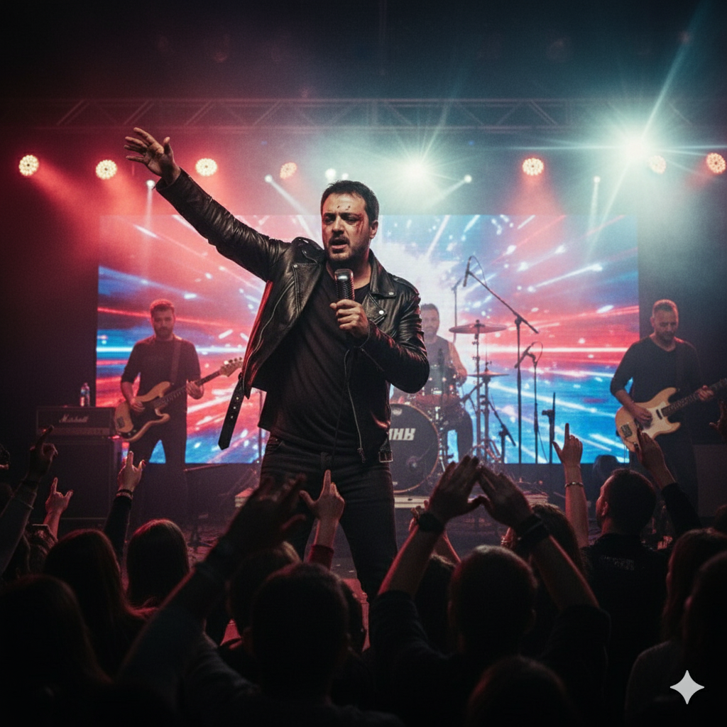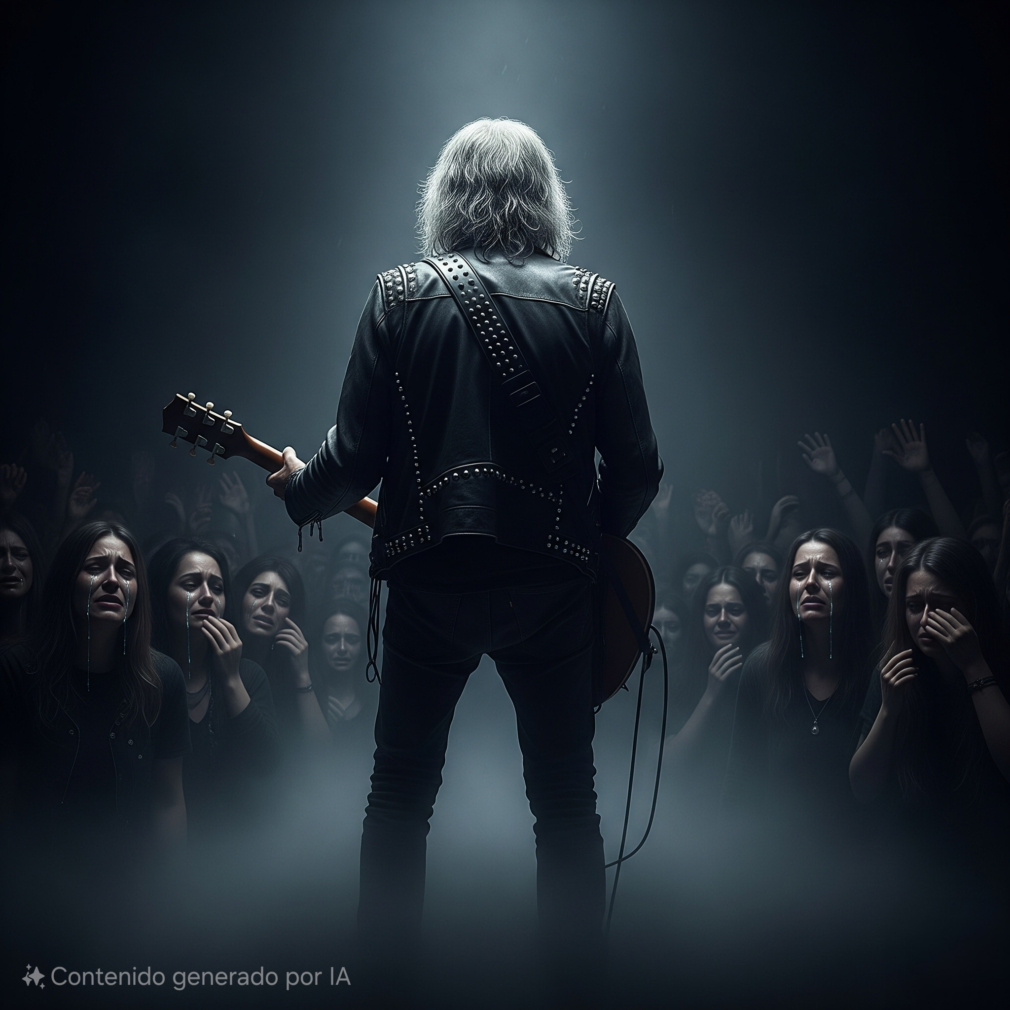 Male rock singer, live stage, long wild hair, gritty voice, wearing old leather jacket, dramatic spotlight, emotional expression, holding electric guitar close, stage smoke, background band visible, crowd waving hands, high-contrast lighting, grainy texture, inspired by 90s Spanish rock, moody atmosphere, close-up angle