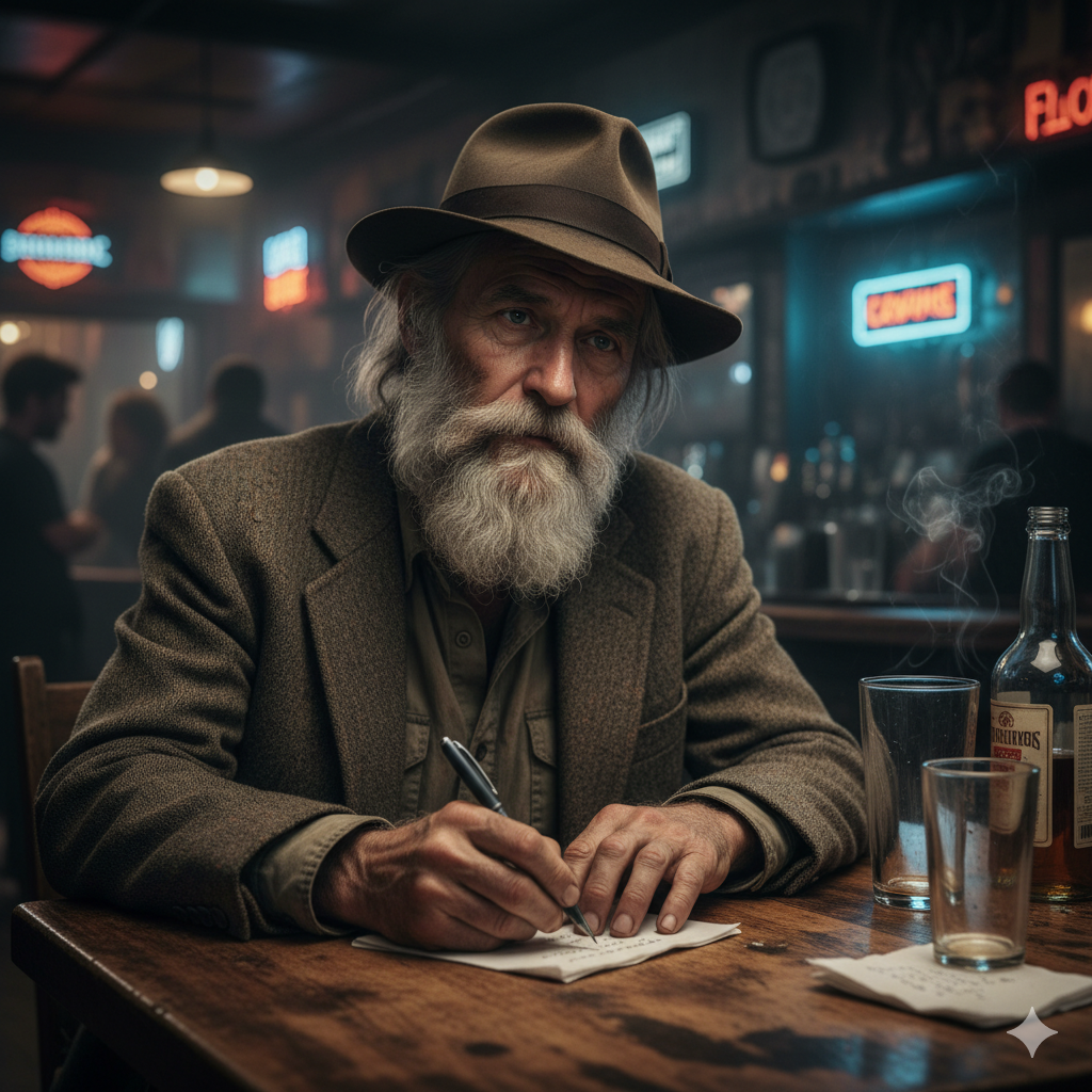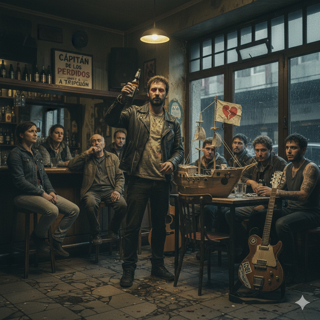Raw Spanish rock ballad in Extremoduro's gritty style, Gravelly male vocals with working-class poetry and street wisdom, Narrative about broken people finding community, Acoustic guitar with overdrive building to powerful electric guitar sections, Driving rhythm section, melodic bass lines, Guitar work: simple but emotionally powerful riffs, bluesy solos with Spanish rock edge, Vocal delivery: storytelling verses with genuine emotion, building to anthemic choruses, Production: raw, honest sound with room ambience, Structure: narrative build with cathartic group-sing choruses, Mood: melancholic but defiant, brotherly, deeply human, Spanish rock meets tavern philosophy and working-class solidarity