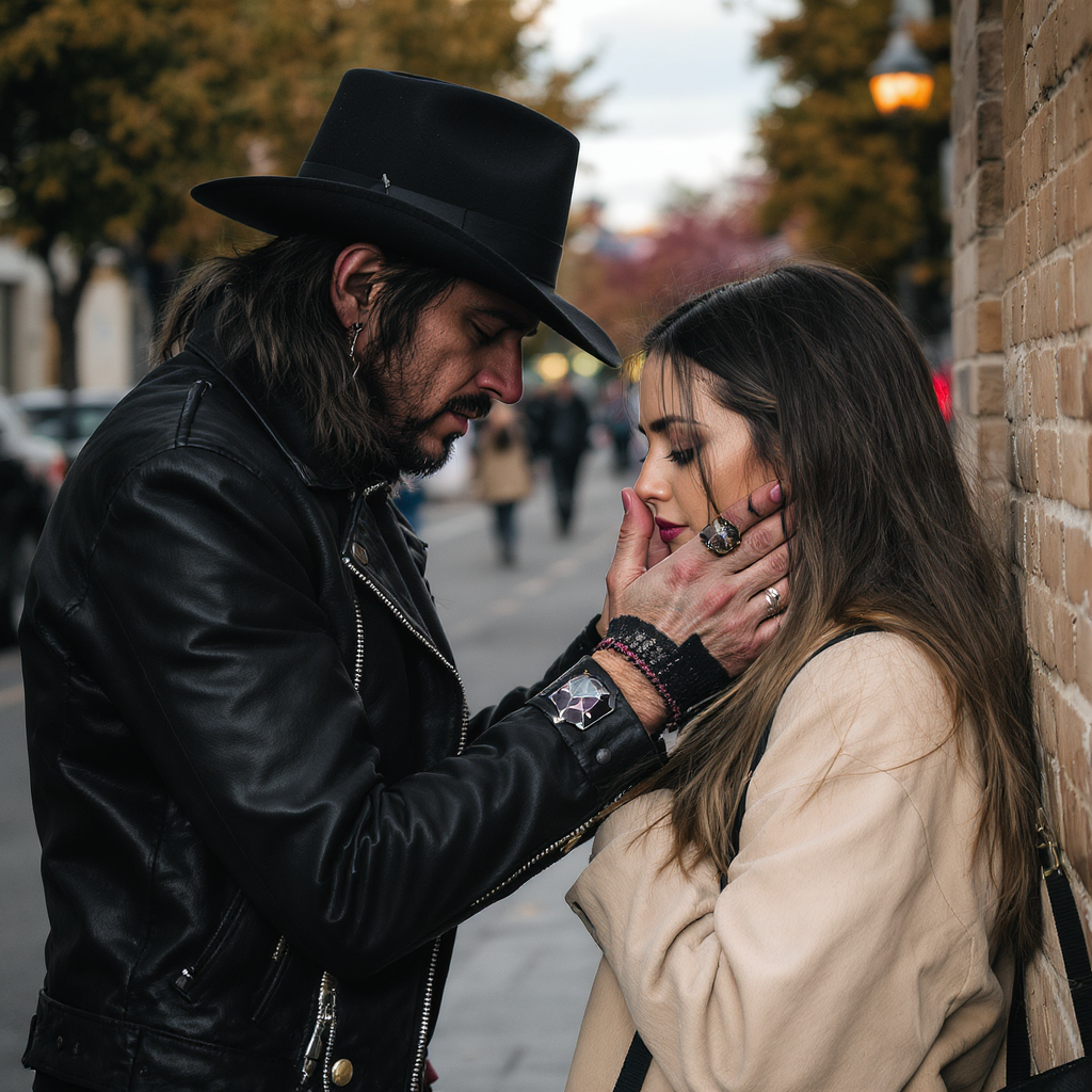 Spanish urban rock ballad with a dramatic and nostalgic vibe, heartbreak and obsession, Gritty male vocals with deep emotional tone, similar to classic rock crooners, Intro with soft clean electric guitar, gentle bass, street ambience (city sounds, distant sax), Verse 1: slow and spoken, melancholic, Pre-Chorus: slight rhythmic build with bass and soft drums, Chorus: full electric guitar, strong beat, powerful shouted background vocals (¡Eh!), Verse 2: faster rhythm, raspy voice, Bridge: guitar solo with nostalgic tone + soft keyboard, ambient saxophone, Final Chorus: stadium-like vocals, intense, all instruments at max, Outro: fade with sax and street sounds, Feels like a story told from a late-night bar in Madrid, Key themes: heartbreak, rebellion, memory, Emphasize black leather, neon lights, rainy streets