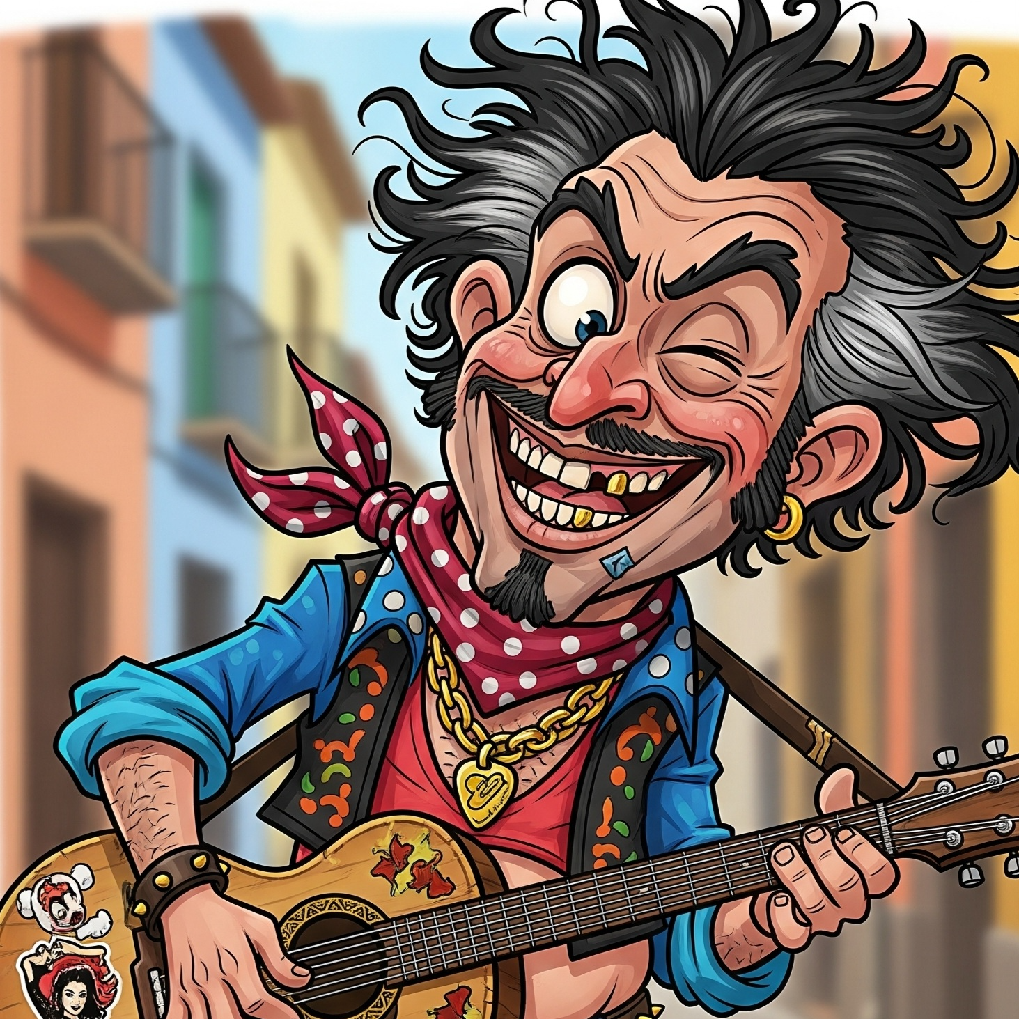 A slow and emotional live rumba performance with rich Spanish acoustic guitars, rhythmic handclaps, and a laid-back bar vibe, The male vocals are raspy, heartfelt, and full of street charm — telling a long, poetic story with clever wordplay, irony, and nostalgic love, The tempo is calm but catchy, like a late-night confession sung with a smile and a sigh, Background includes subtle percussion like cajón and palmas, echoing a small tablao or smoky tavern, Harmonies appear gently in the chorus, with a soft female voice adding warmth, The performance is raw, sentimental, cheeky, and deeply personal — like singing truths over the last drink of the night