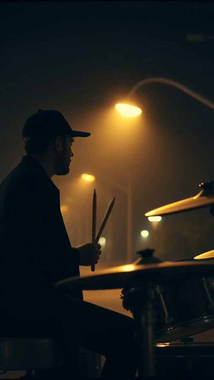 Groovy night jazz-pop driven by expressive drum performance, Tempo: around 110–115 BPM, Start with gentle hi-hat taps and light snare brushes, creating a sense of calm focus, Gradually layer in kick rhythm and rimshots — the drums take center stage, leading the emotion, Bass and electric piano support with warm, minimal chords to leave space for the percussive groove, At the midpoint, the drummer opens up — dynamic fills, ride cymbal swings, and rhythmic variations fill the space with movement and freedom, No saxophone or brass — keep the focus on rhythm and groove, In the climax, drums and bass lock into an energetic yet fluid groove, capturing the feeling of being lost in the moment, End by gently fading back to soft taps, as if the heartbeat slows under the quiet streetlight, Mood: free, immersive, joyful — celebrating rhythm itself
