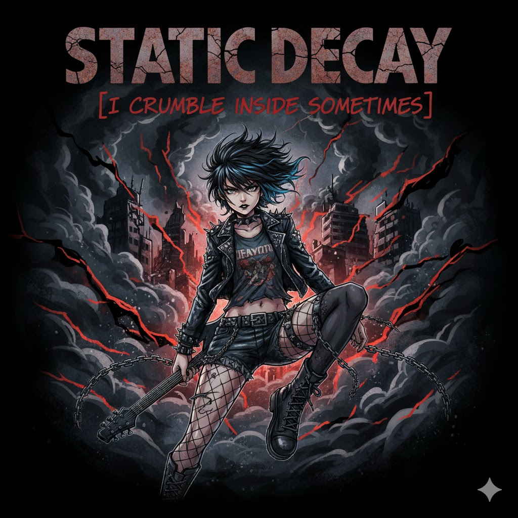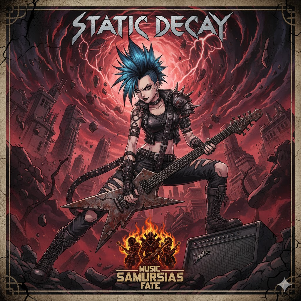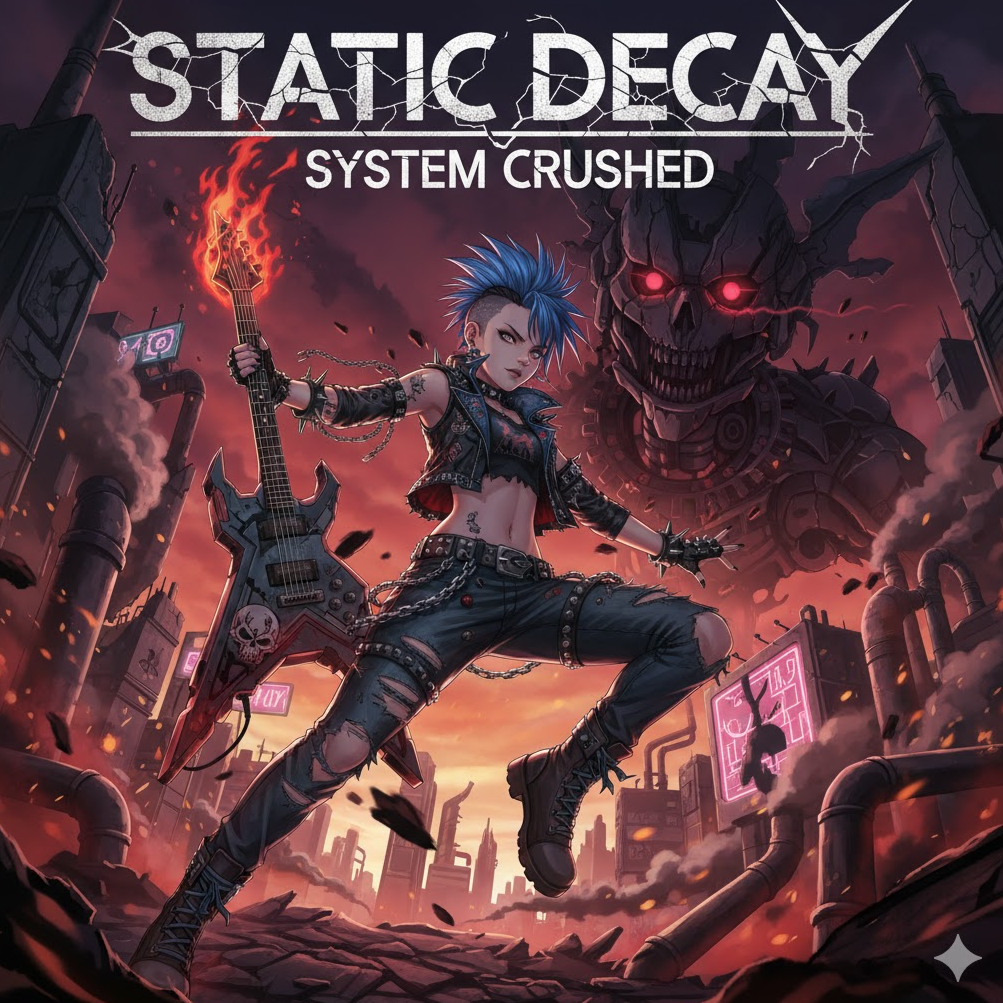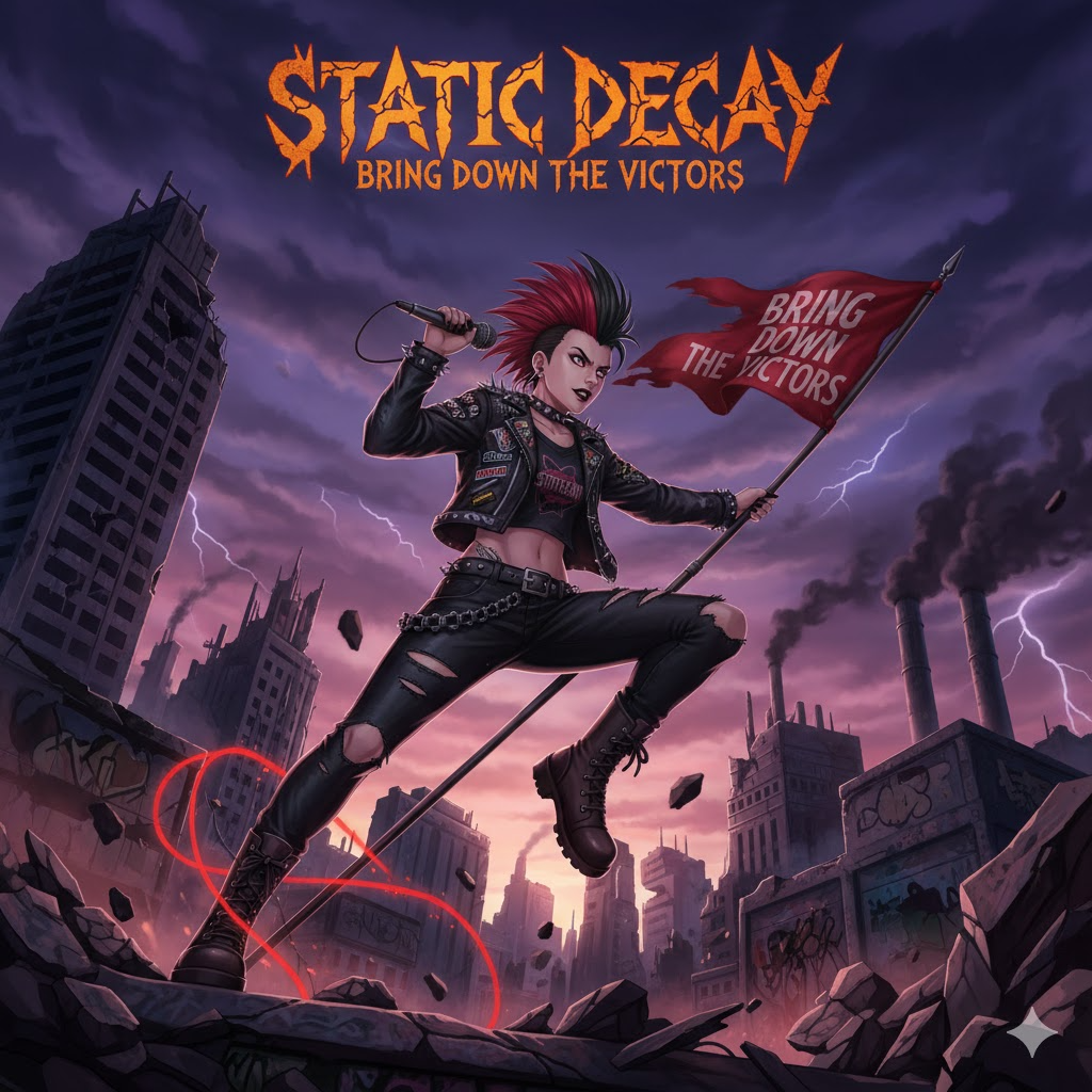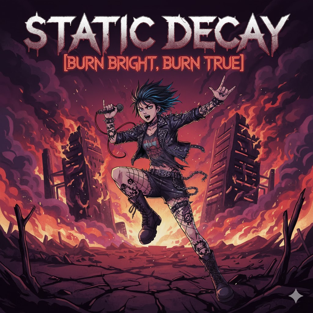 punk/alternative metal, punk guitar solos, Female lead singer only, female vocals ranging from f3 to g5, rage against the machine song vibe, bands name [static decay] before the first verse, punk grit