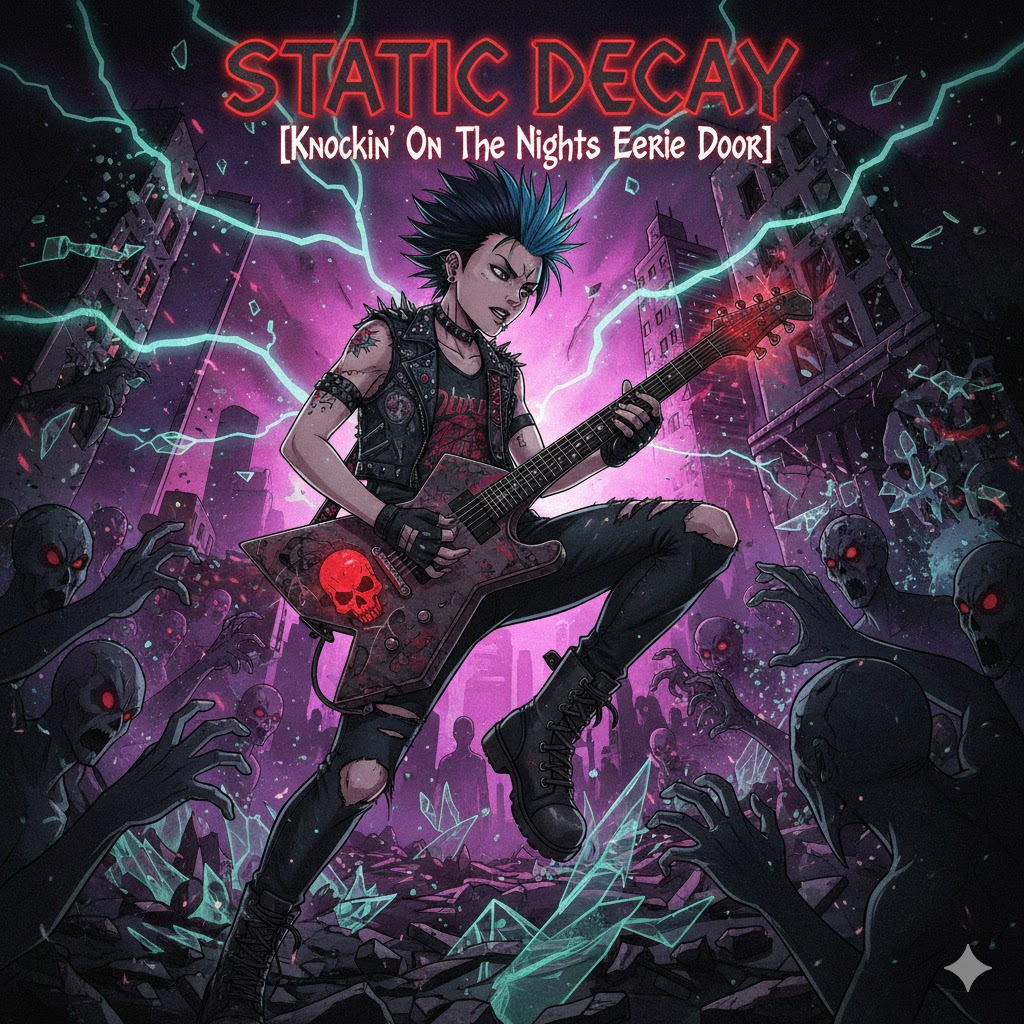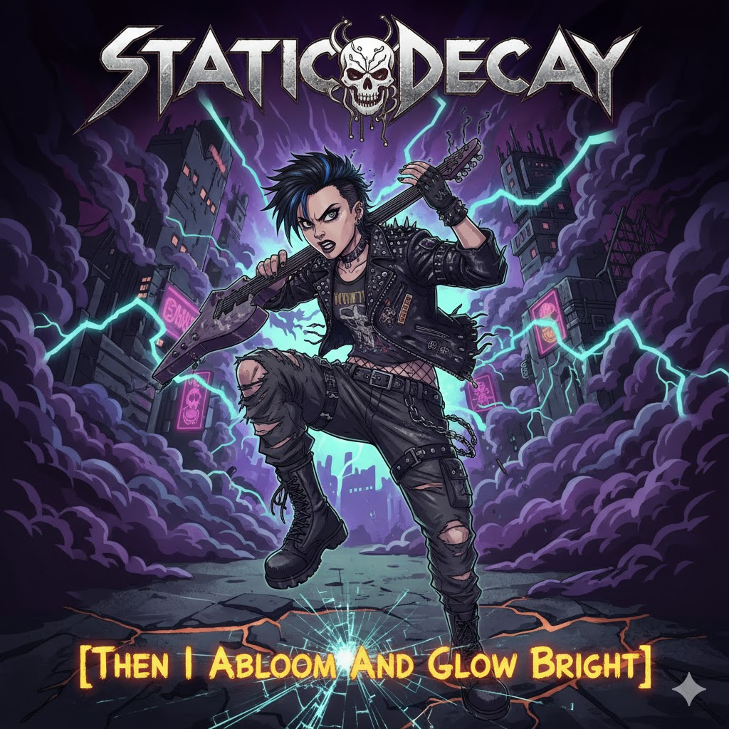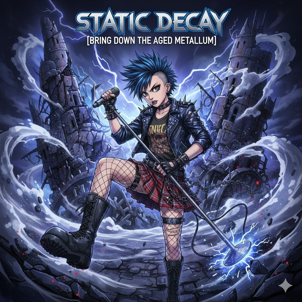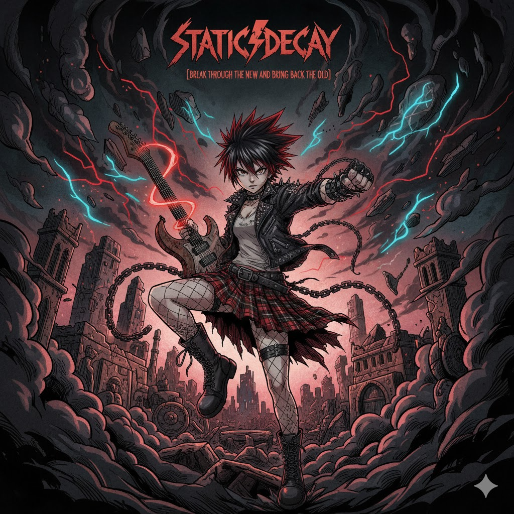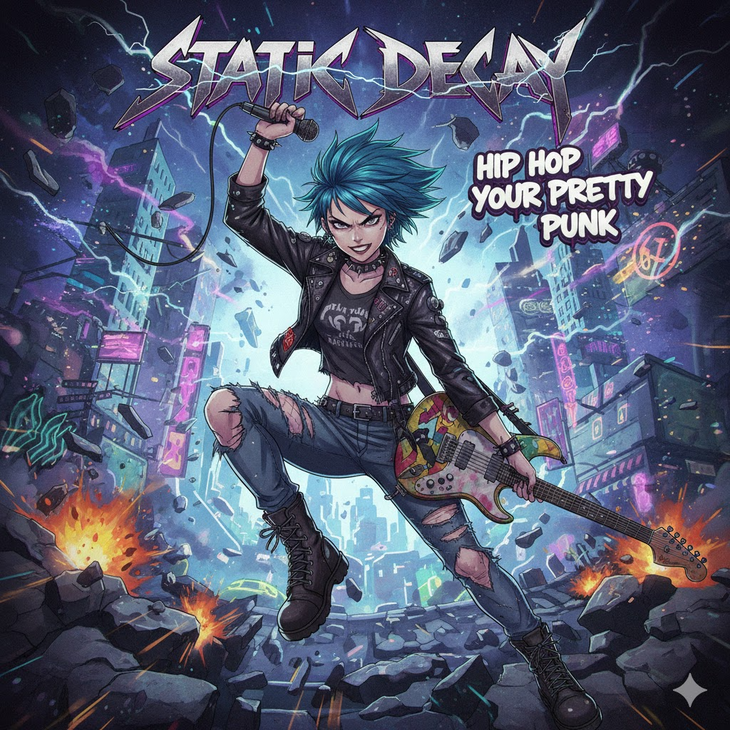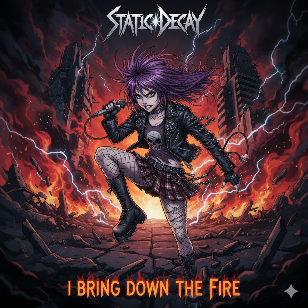 punk/alternative metal, punk guitar solos, Female lead singer only, female vocals ranging from f3 to g5, rage against the machine song vibe, bands name [static decay] before the first verse, punk grit