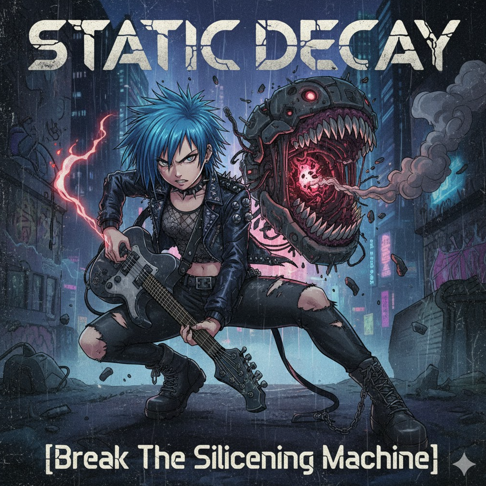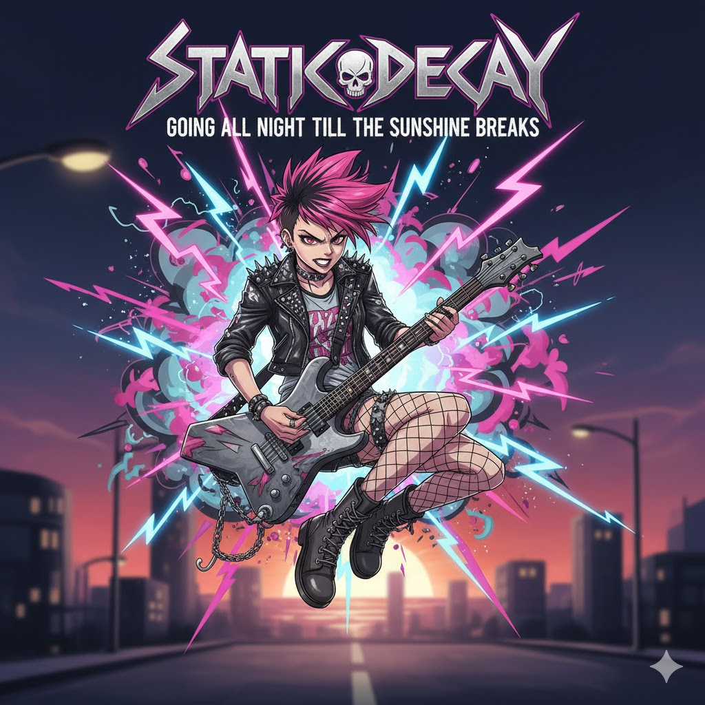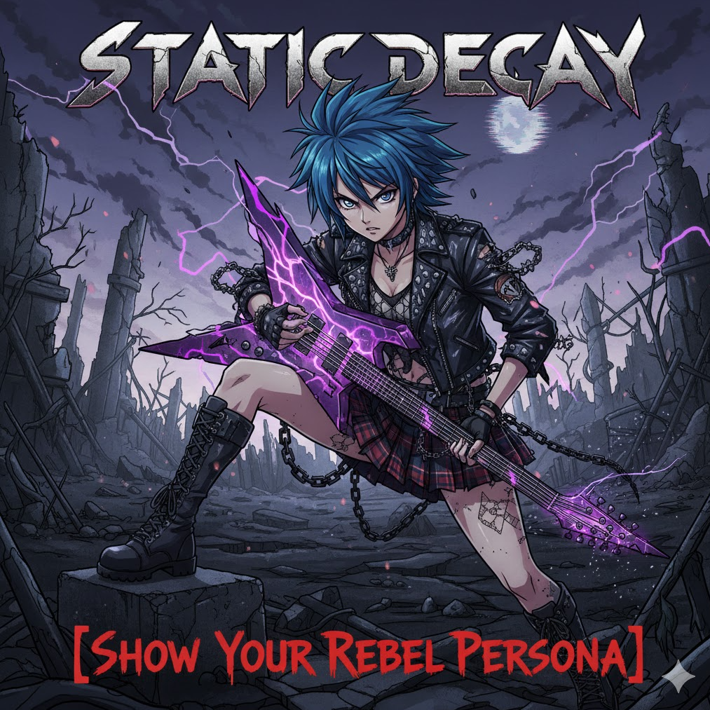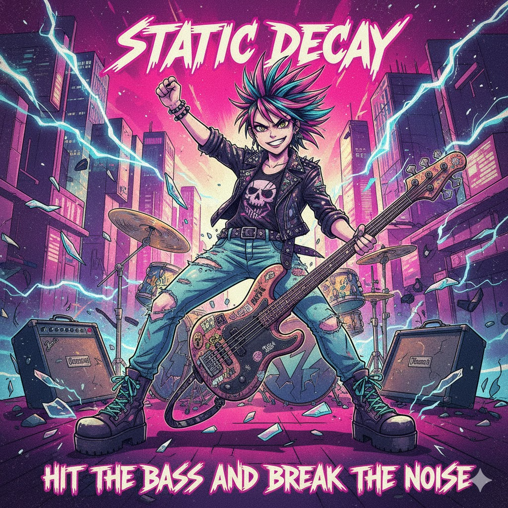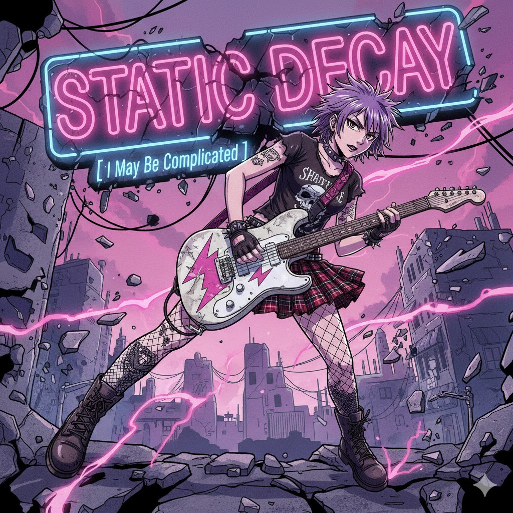 punk/alternative metal, punk guitar solos, Female lead singer only, female vocals ranging from f3 to g5, rage against the machine song vibe, bands name [static decay] before the first verse, punk grit