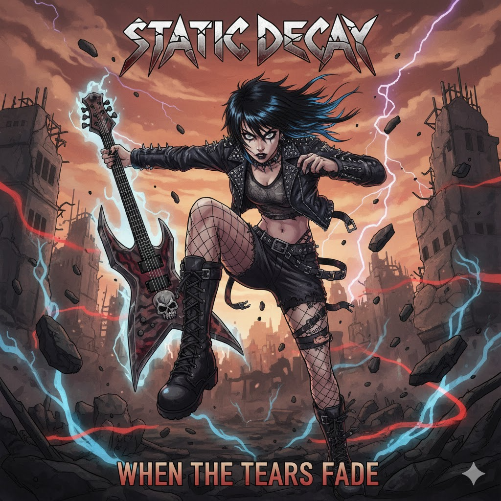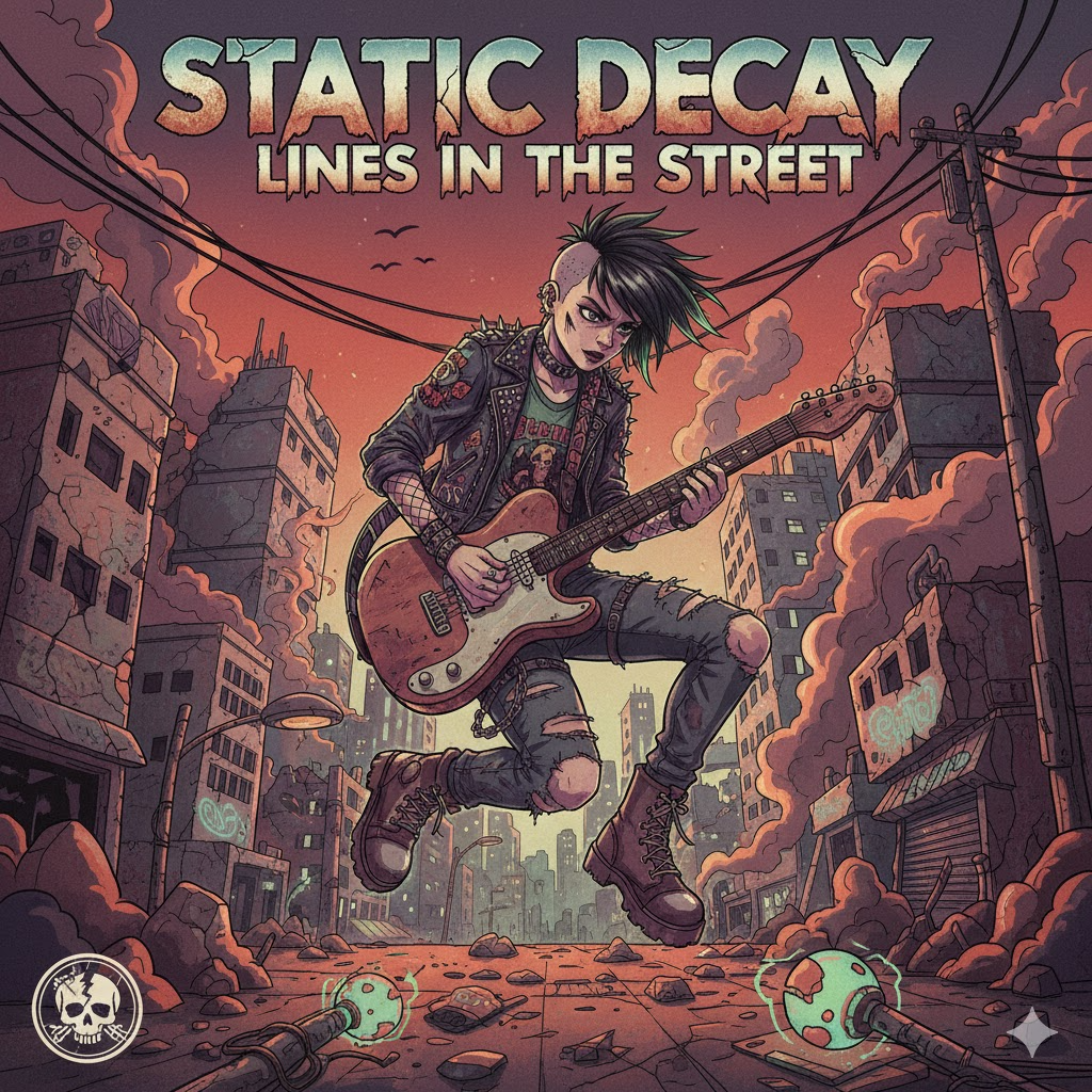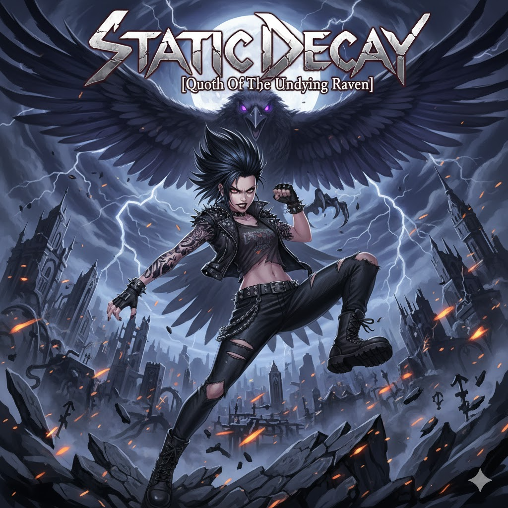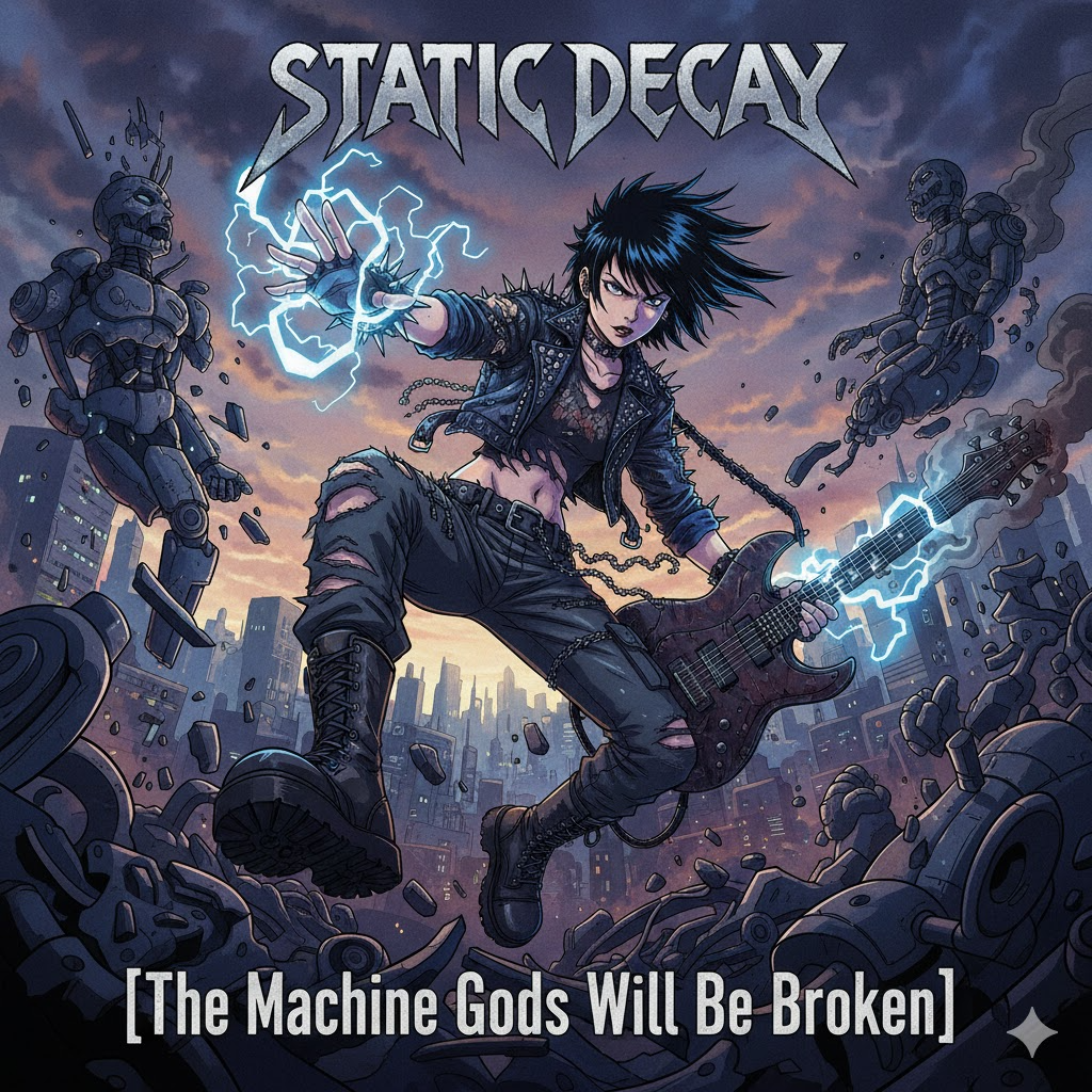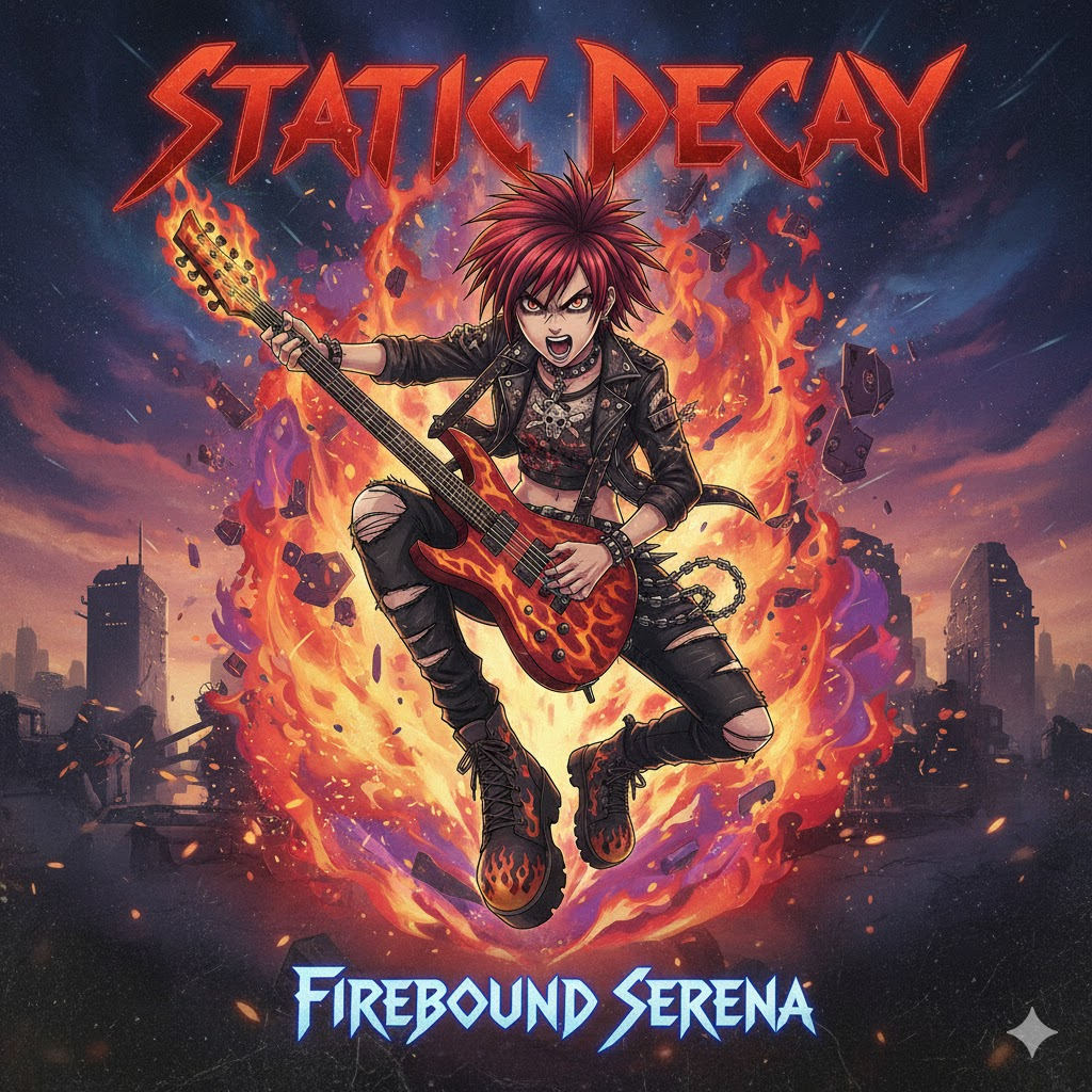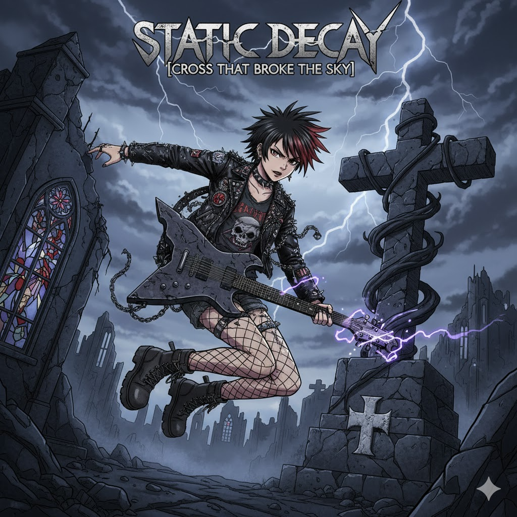 punk/alternative metal, punk guitar solos, Female lead singer only, female vocals ranging from f3 to g5, rage against the machine song vibe, bands name [static decay] before the first verse, punk grit