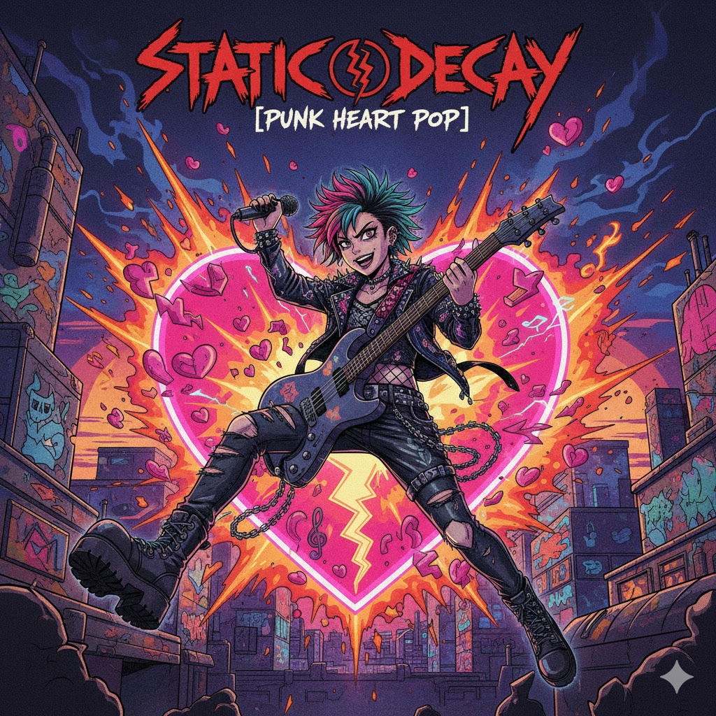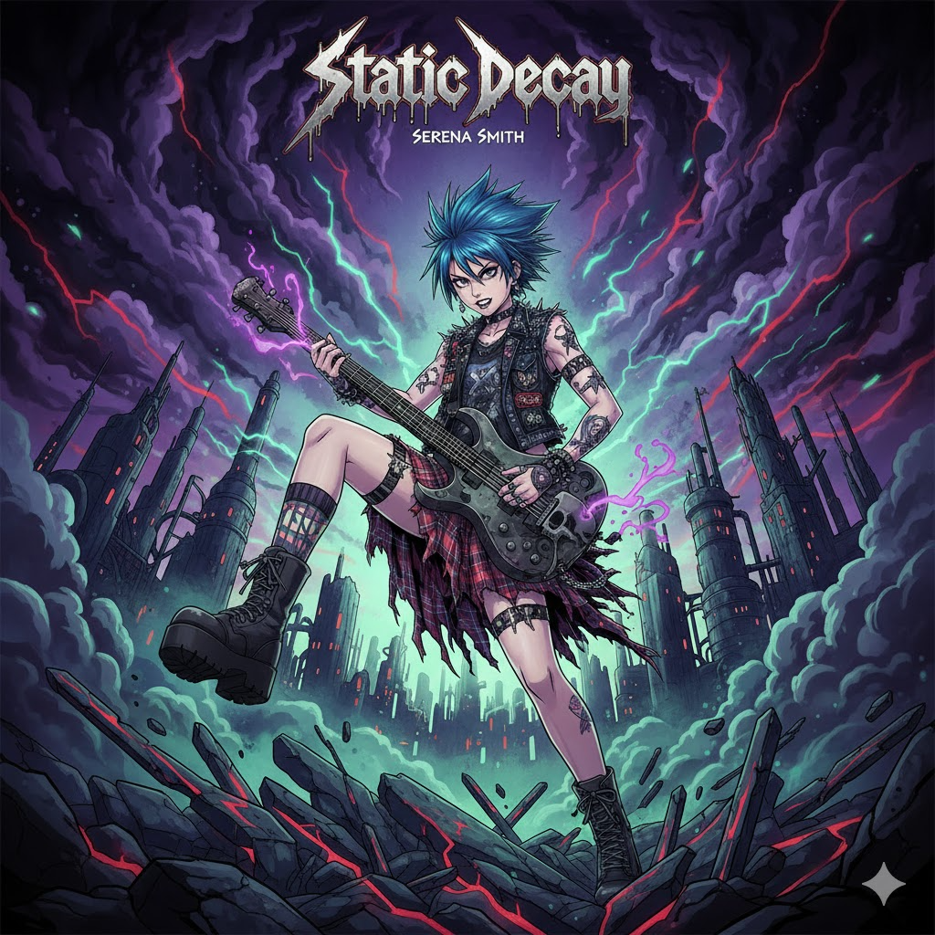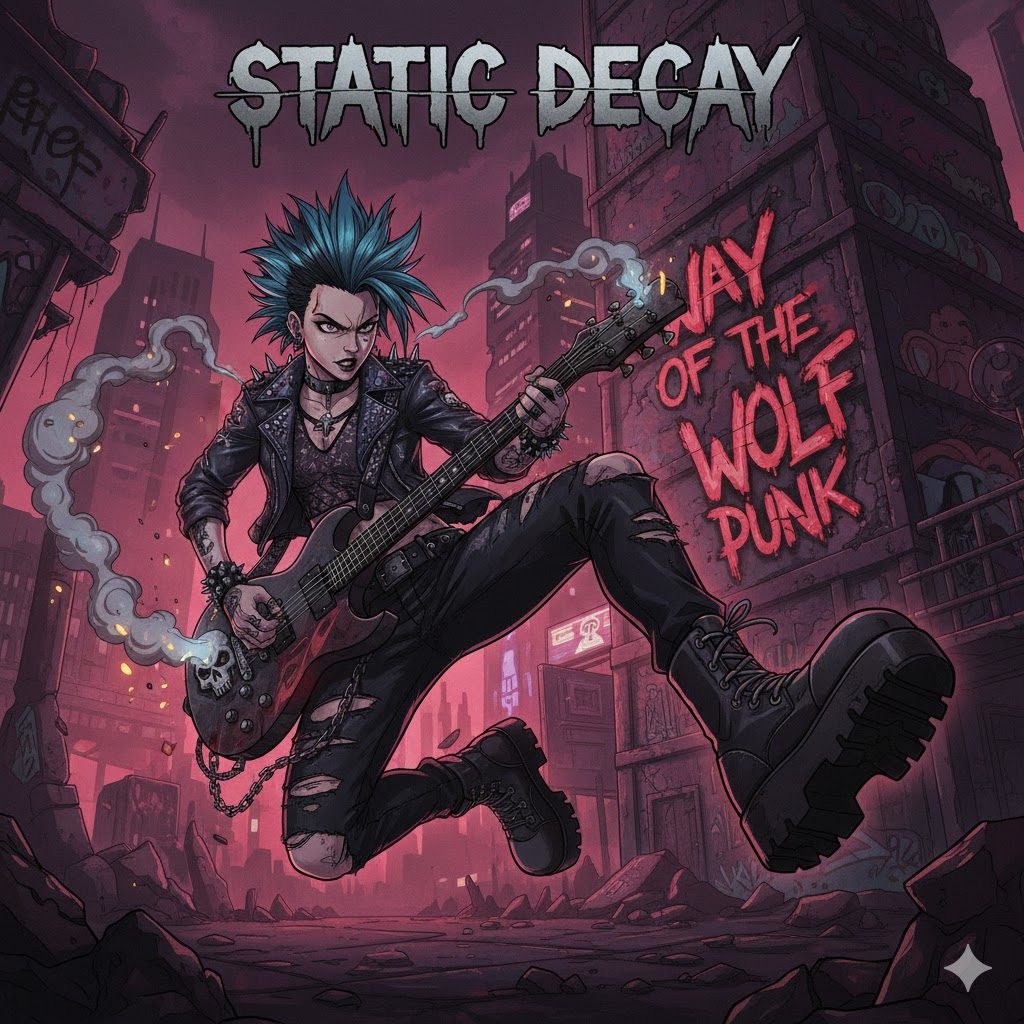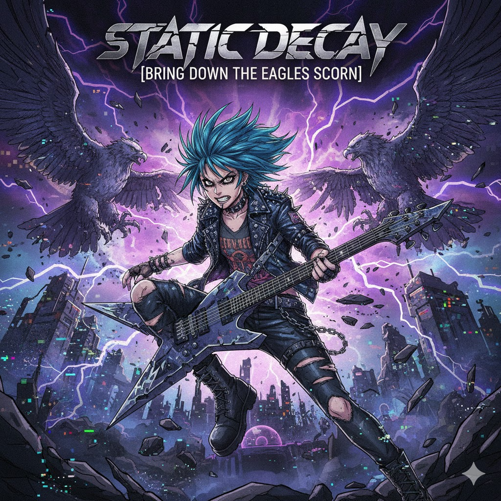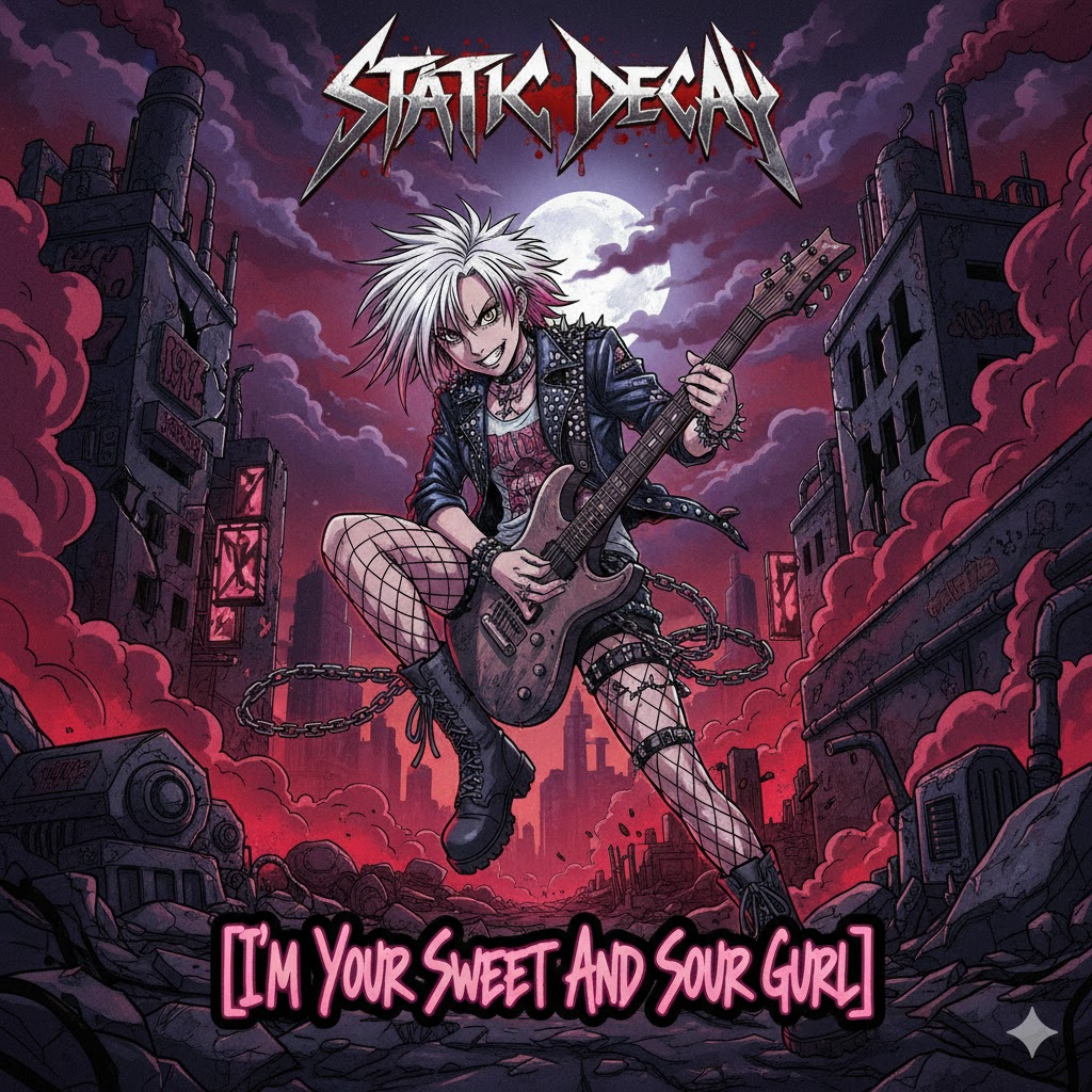 punk/alternative metal, punk guitar solos, Female lead singer only, female vocals ranging from f3 to g5, rage against the machine song vibe, bands name [static decay] before the first verse, punk grit