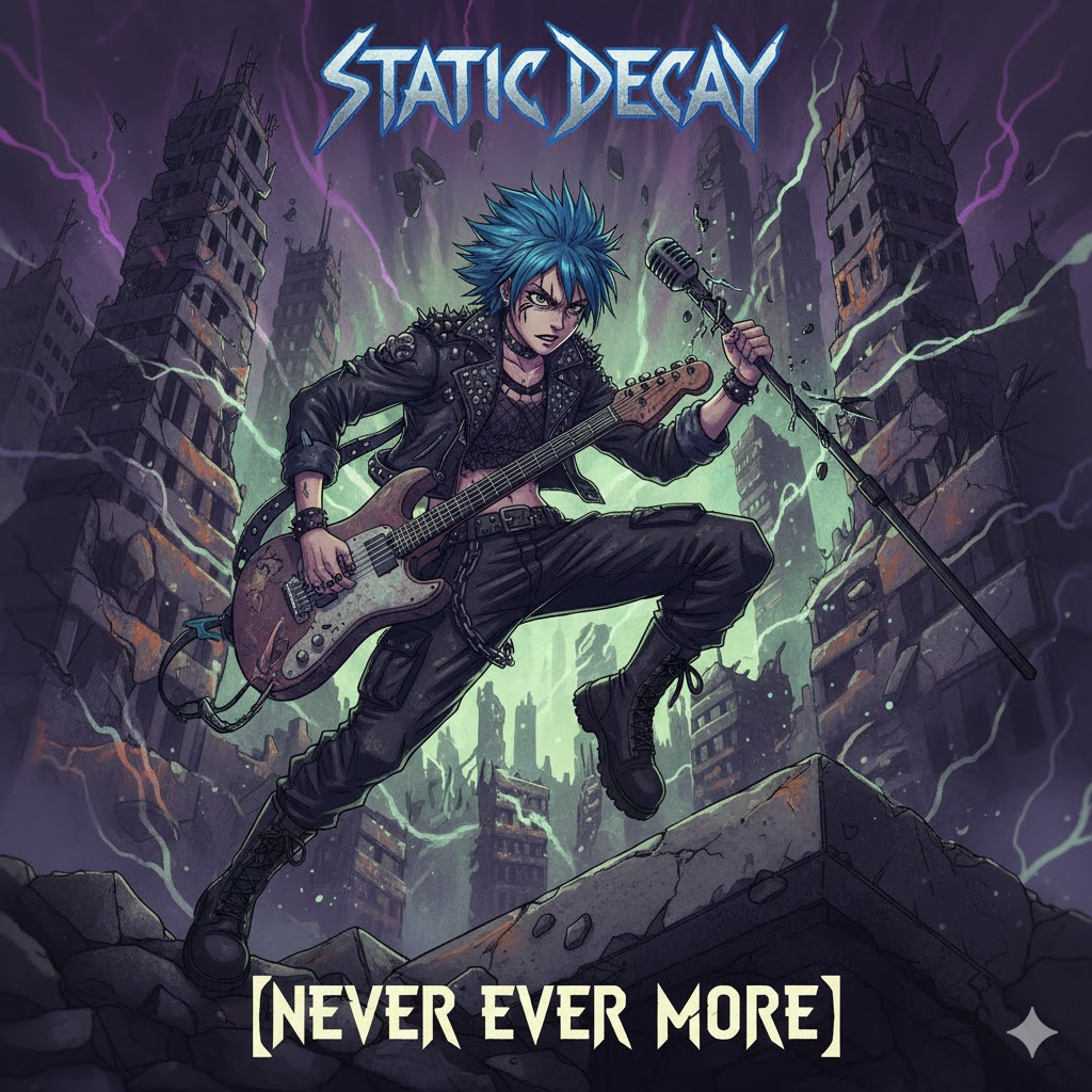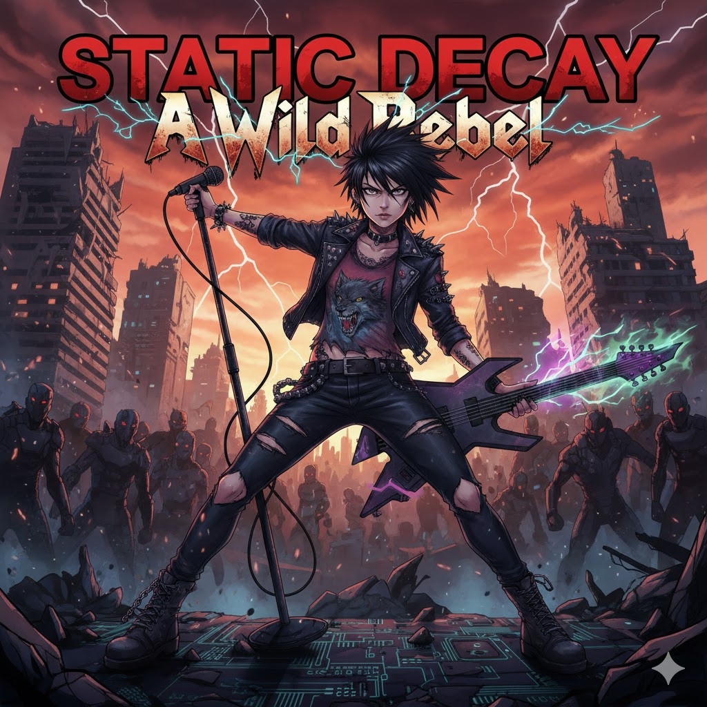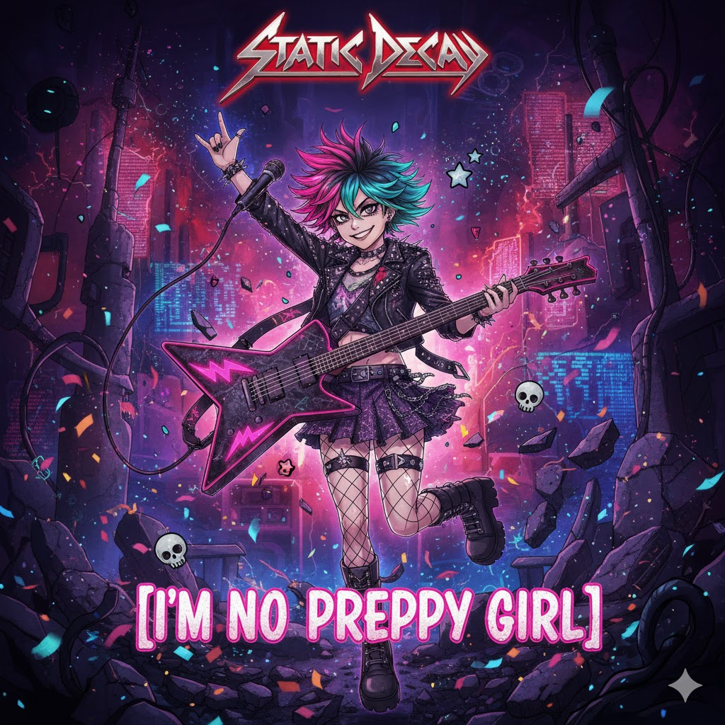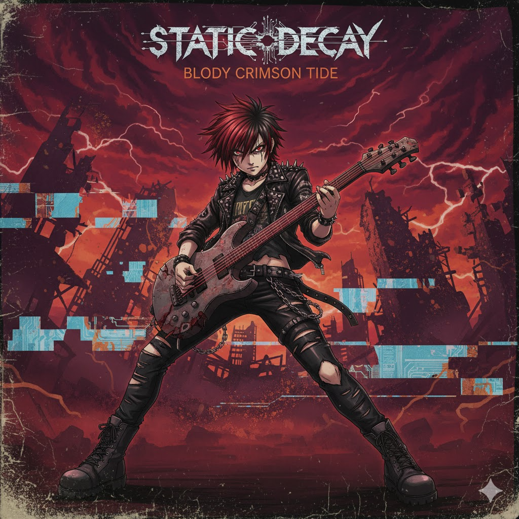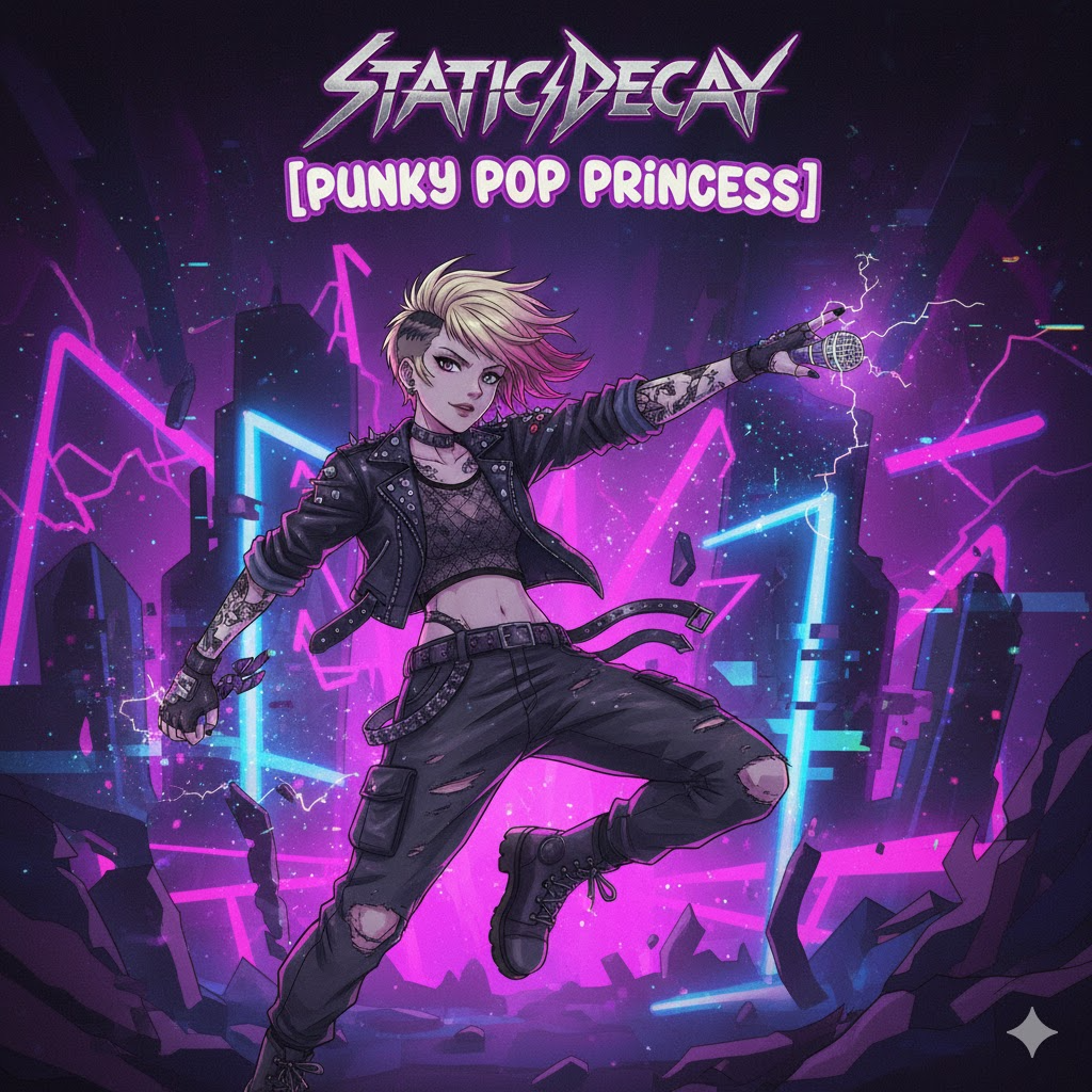 punk/alternative metal, punk guitar solos, Female lead singer only, female vocals ranging from f3 to g5, rage against the machine song vibe, bands name [static decay] before the first verse, punk grit