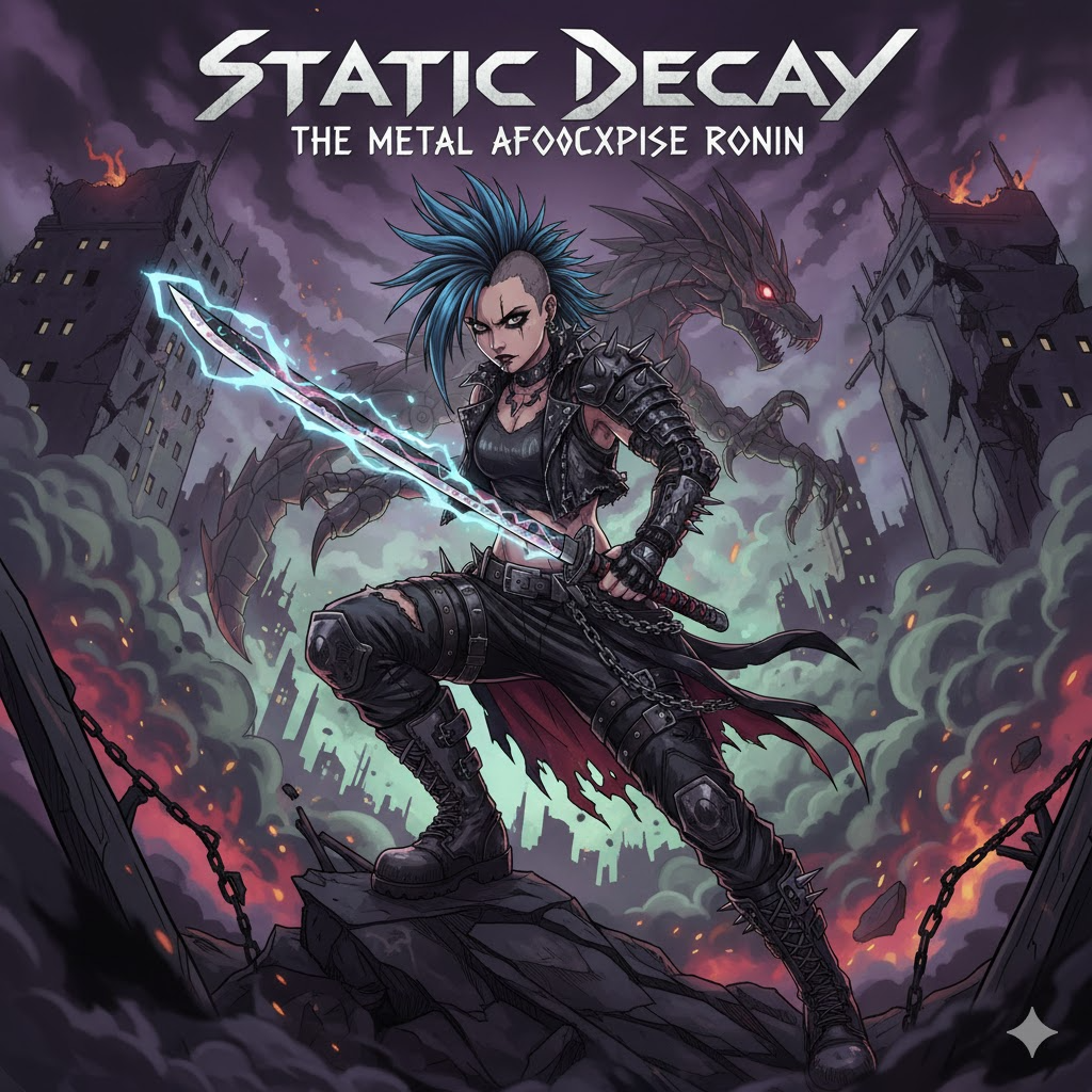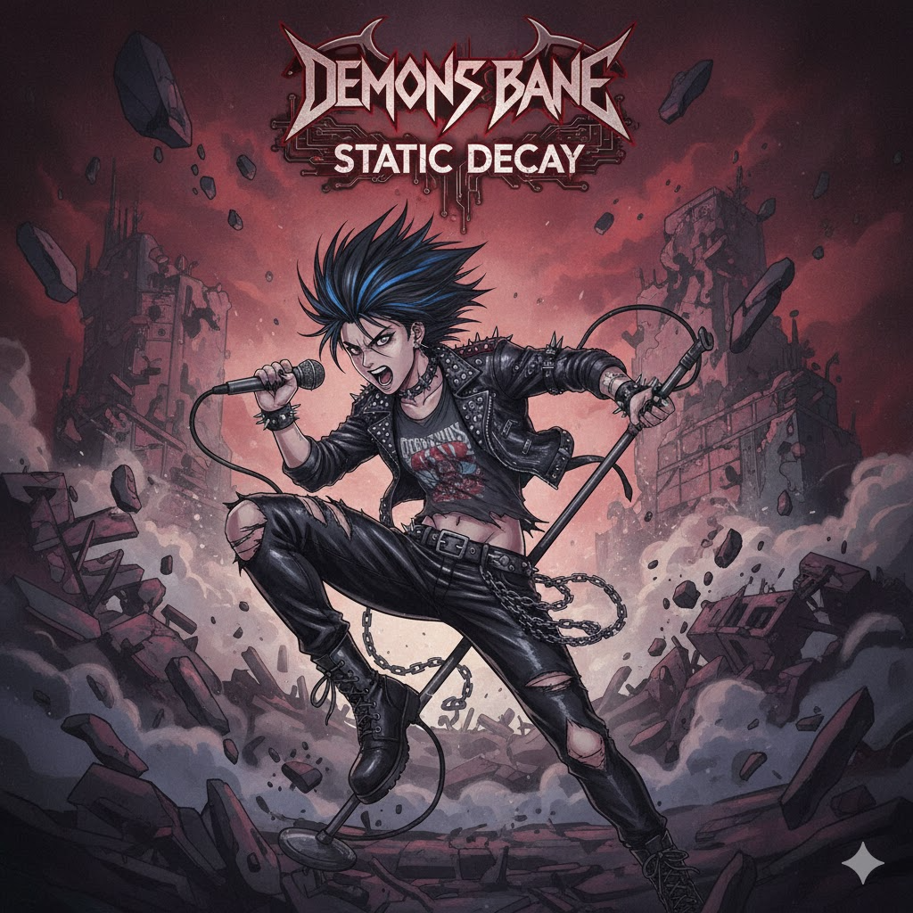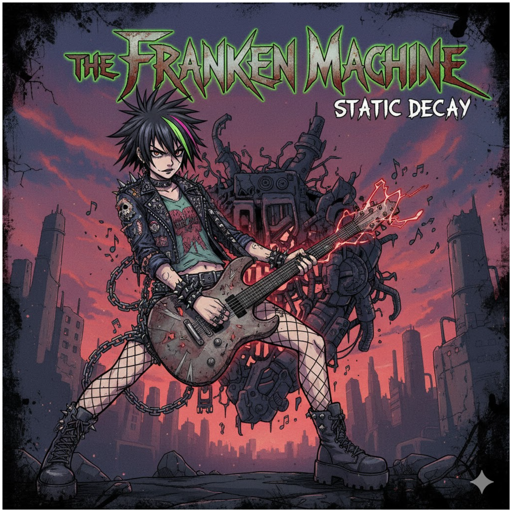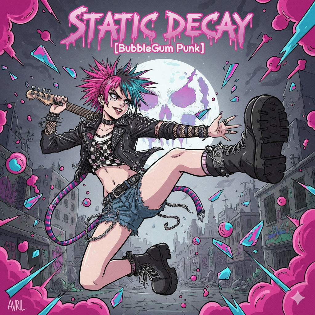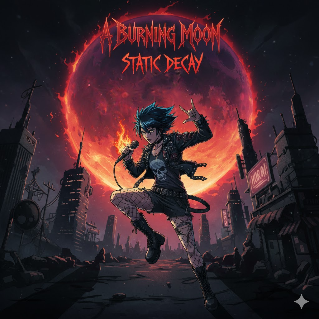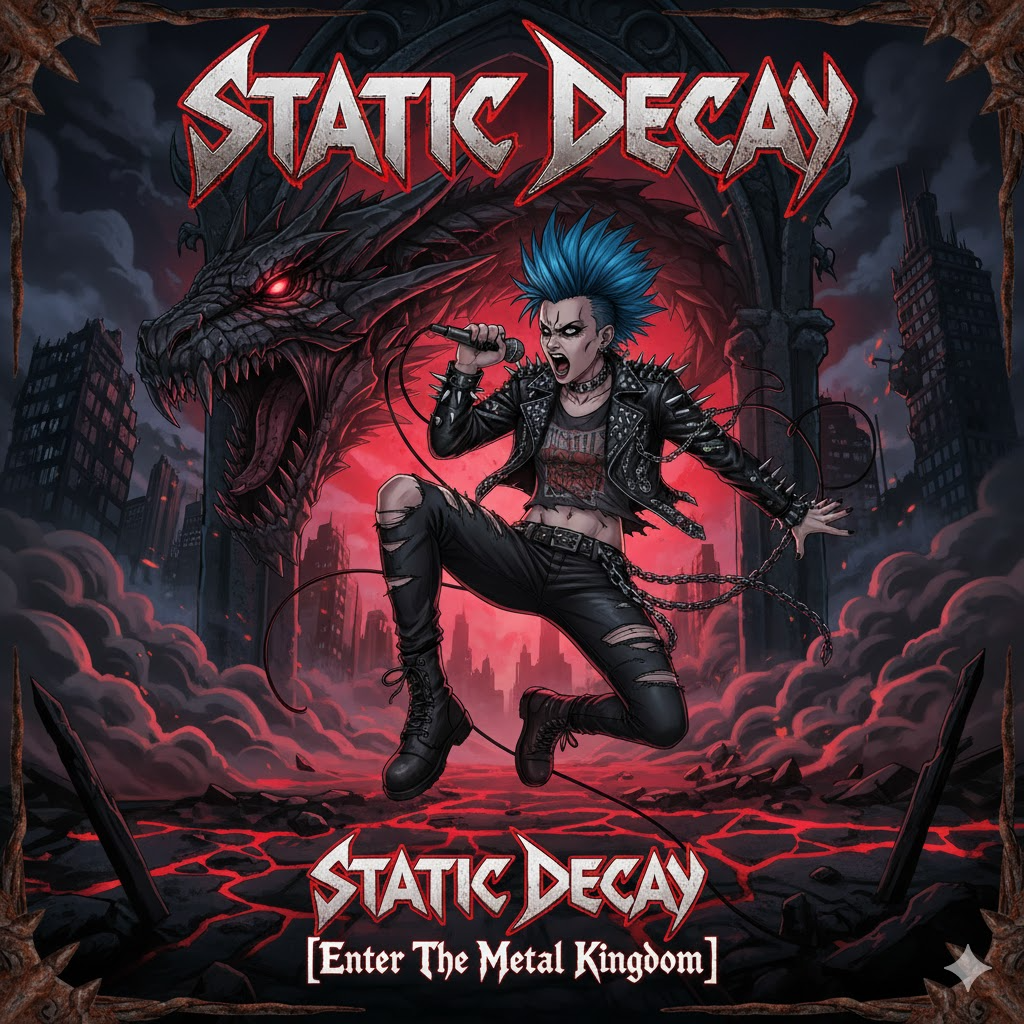 punk/alternative metal, punk guitar solos, Female lead singer only, female vocals ranging from f3 to g5, rage against the machine song vibe, bands name [static decay] before the first verse, punk grit