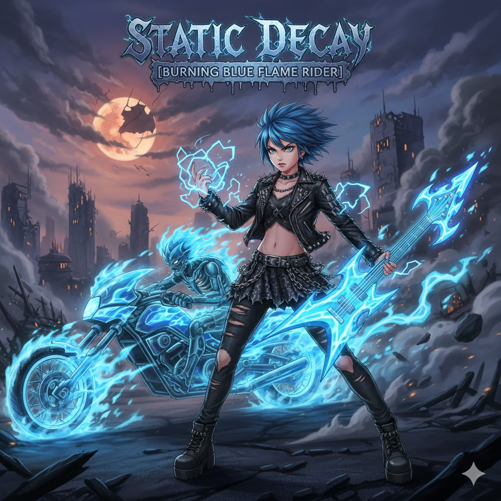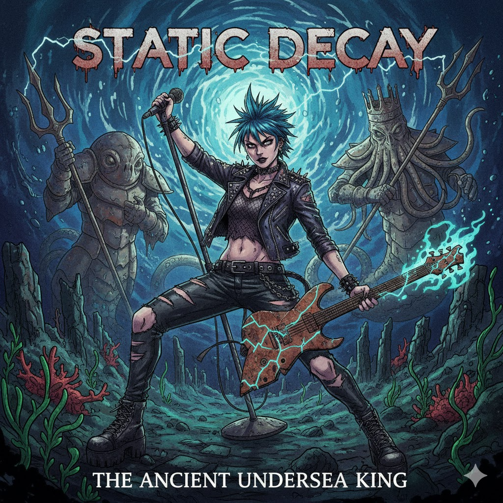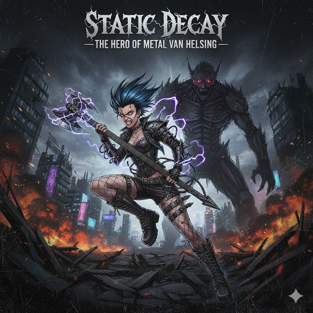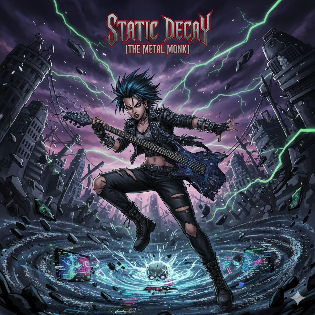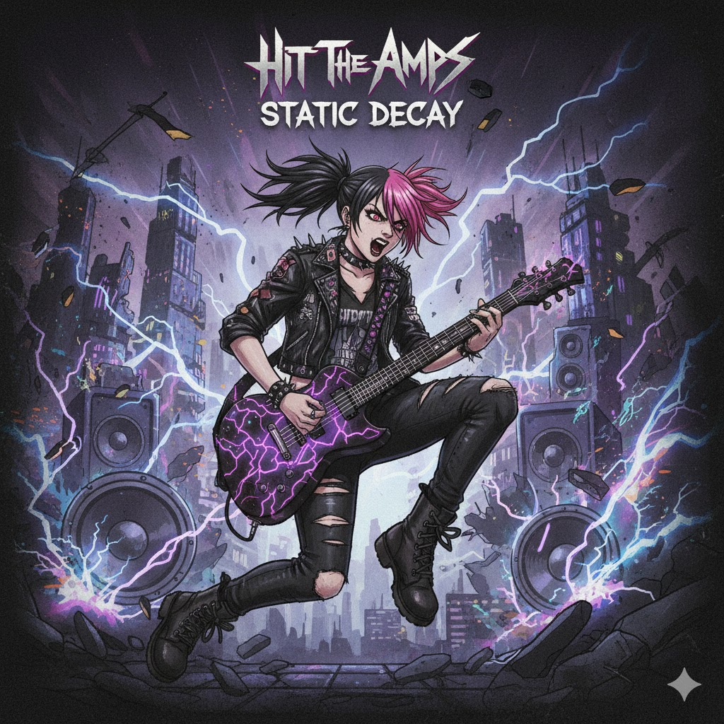 punk/alternative metal, punk guitar solos, Female lead singer only, female vocals ranging from f3 to g5, rage against the machine song vibe, bands name [static decay] before the first verse, punk grit