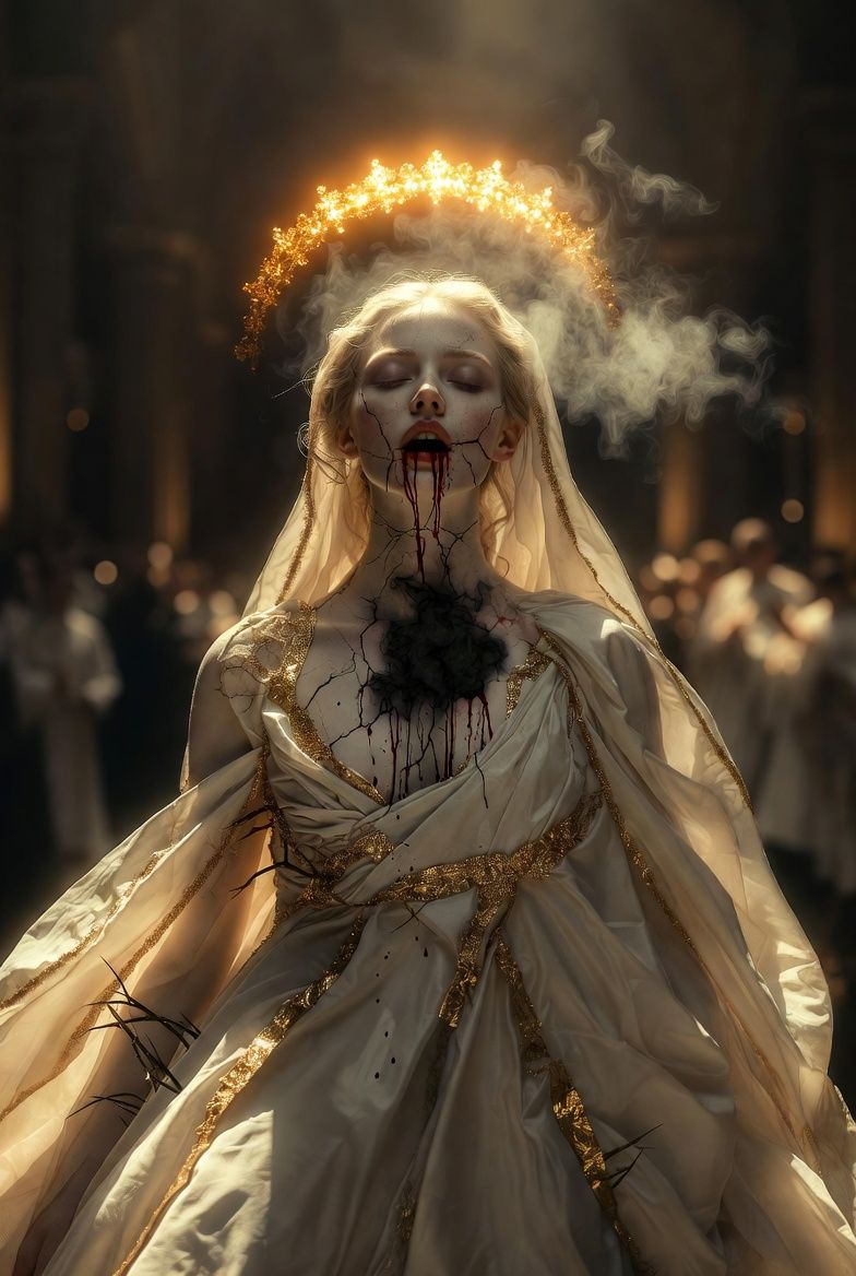darkwave electropop with progressive metal architecture and sacred horror undertones featuring poppy and instrumental rock, progressive metal, hard rock, virtuoso guitar drop c tuning e phrygian with brief e major resolution at breakdown pulled back before resolution holds tempo mapping 58 bpm devotional intro building through 76 bpm verses into 92 bpm electrometal chorus dropping to 44 bpm whispered breakdown returning to 92 bpm finale dissolving to 58 bpm poppy delivering crystalline angelic clean into unsettling upper register alien tone with intimate spoken breakdown instrumental rock, progressive metal, hard rock, virtuoso guitar e phrygian solo restrained reverence fracturing into transcendent grief finding a body single e major resolution held three beats before phrygian reclaims it ocean way studios crystal singing bowls beneath signal ribbon mic at 40ft spatial devastation uncompressed peak contact mic parchment texture intro sidechain electro pulse chorus mastered 10 lufs