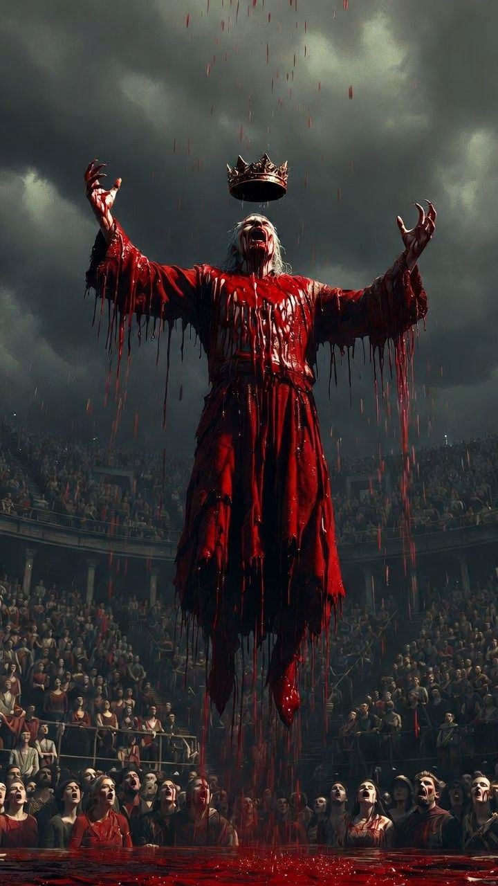 Groove metal with theatrical horror edge and red thread rage aggression, fuses thrash-metal's down-tuned riffsβchunky 7-string chugs at 120 BPMβwith rapid rap flows synced via quantized beats for seamless crossover, Structure: Faint string-pluck intro builds tension (reverb-heavy, like echoing binds) Drop C, 85 BPM ceremonial intro, 92 BPM verses, 105 BPM crushing chorus, 88 BPM John 5-style solo, 95 BPM 5/4 bridge, 108 BPM final chorus fading to 80 BPM outro, Randy Blythe-style ferocious serpentine growls with clear enunciation and guttural power, John 5-style horror instinct gothic theatrical with killswitch stutter as blood drops, whammy dives like falling bodies, ring modulator haze, Chunky 7-string chugs, 808 subs under guitars, sidechain pump on bass, high-pass clarity, mastered -8 LUFS, Blood throne spectacle β the crowd cheers while the floor drinks deep