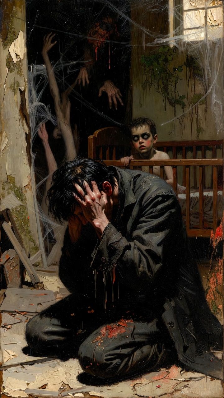 heavy groove metal with southern gothic horror textures and post-grunge emotional weight, drop c (down whole step), 75 bpm intro, 90 bpm verse with swaying gallop rhythm, 115 bpm chorus, 85 bpm john 5-style solo, ryan McCombs-style throaty soulful vocals shifting from exhausted whisper to gravel-tinged soaring roar, voice carrying the sedimentary layers of inherited damage, john 5-style southern gothic horror: chicken picking like bone-snapping through telecaster twang, banjo-roll influences in drop c, whammy bar dips as room tilting, surgical precision cutting through scar tissue, contact mics on rotting wood and cobweb silk, the room where love once lives reclaimed by rotβtrauma replicating across generations, the child in the crib waiting to inherit the posture of despair, the kneeling figure becoming part of the foundation, mastered -9 LUFS