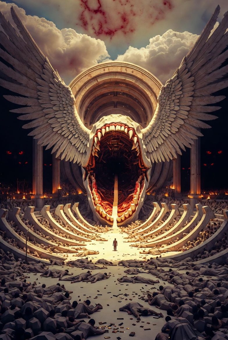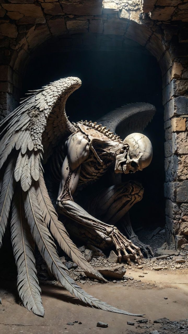 post-grunge alternative metal with dark trap textures and industrial hip-hop weight, drop c, 70 bpm intro, 88 bpm verse, 112 bpm chorus, 95 bpm Babytron-style rap verse, Shaun Morgan-style hollow weathered vocals shifting to scarred soaring catharsis, voice carrying the burden of spent glory, babytron-style dark trap flow: rapid-fire punchlines over distorted 808s and heavy undertow, grim wordplay on skeletal architecture and concrete wings, flow pinned by gravity's verdict, contact mics on stone wings and rubble, the archangel hunched in the cellarβwings still magnificent but made of stone, pinned beneath the mathematics of a flight that ended long ago, mastered -9 lufs