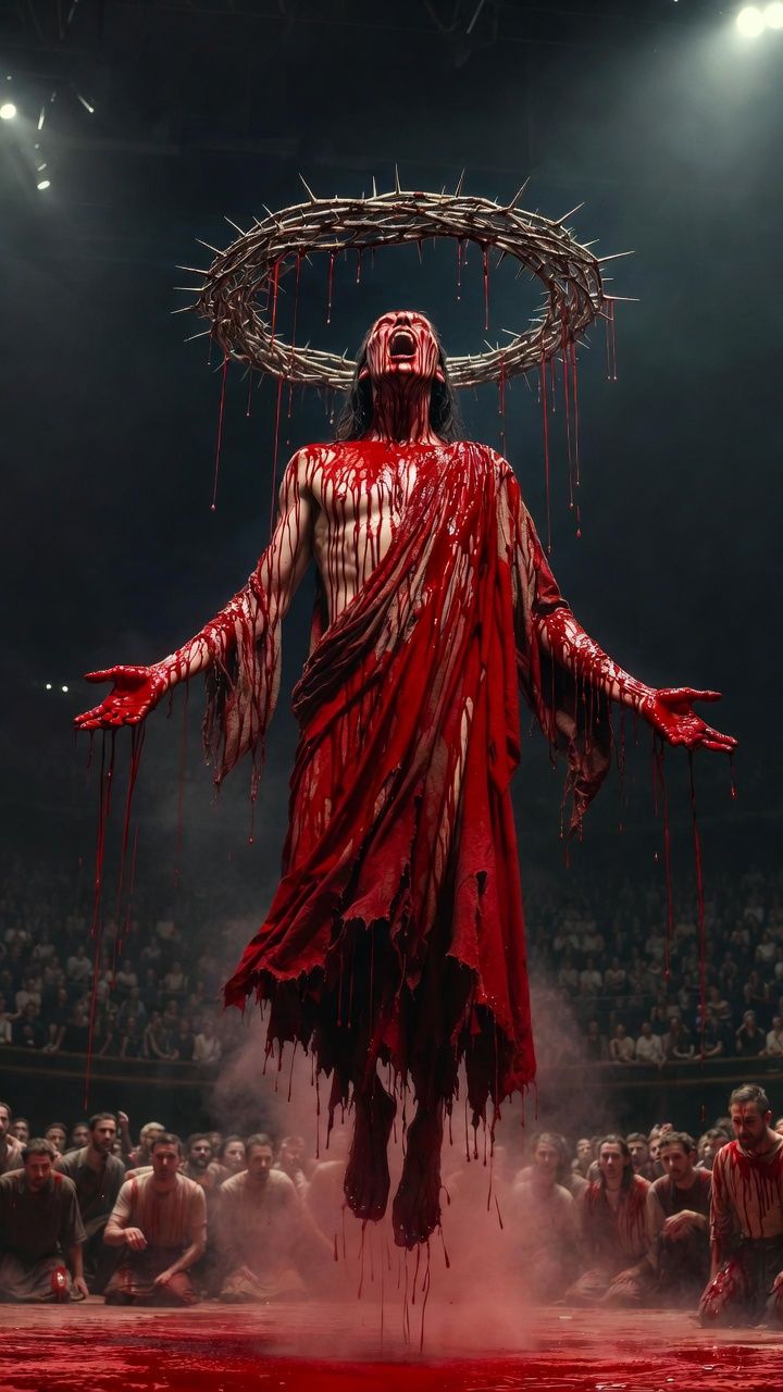 Modern groove metal with theatrical horror edge and red thread rage aggression, Drop C, 82 BPM ceremonial intro, 90 BPM verses, 104 BPM crushing chorus, 88 BPM John 5-style solo, 100 BPM Eminem-style rap section, 94 BPM 5/4 bridge, 108 BPM final chorus fading to 78 BPM outro, Chaoseum-style aggressive delivery with clear enunciation and guttural power, John 5-style horror instinct gothic theatrical with killswitch stutter as blood drops, whammy dives like falling bodies, ring modulator haze, Chunky 7-string chugs, 808 subs under guitars, sidechain pump on bass, high-pass clarity, mastered -8 LUFS, Halo of bleeding thorns β the ritual never ends