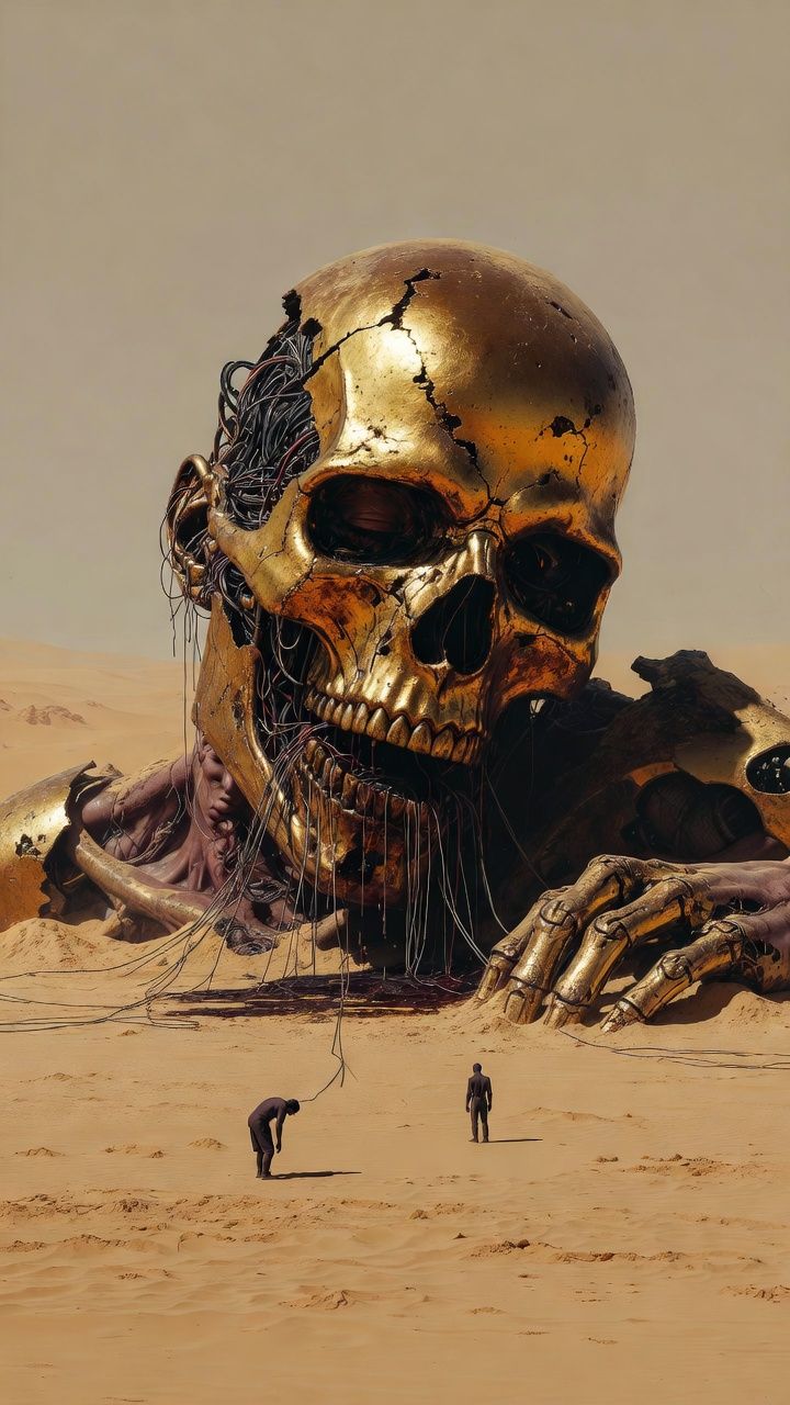metal rap hybrid wasteland devastation lamb of god primary randy blythe style moving between exhausted spoken word and full feral howl drop d polyrhythmic collapse architecture chris adler inspired drum patterns as primary solo instrument Hip Hop, Rap, Hardcore Hip Hop, Midwest Hip Hop style co star rapid precision surgical rap shifting from clinical to raw grief syllable dense indictment delivered over burning structure drop d 7 4 into 5 4 into 4 4 rhythmic disorientation ground never reliable underfoot 44 108 bpm wasteland arc d minor no resolution contact mic desert sand and wind throughout mechanical god face down in the dirt still draining still wanting two figures standing in aftermath deciding whether to leave mastered 9 lufs the moment you realize the thing you organized your life around was never alive and neither leaving nor staying feels like a real option anymore