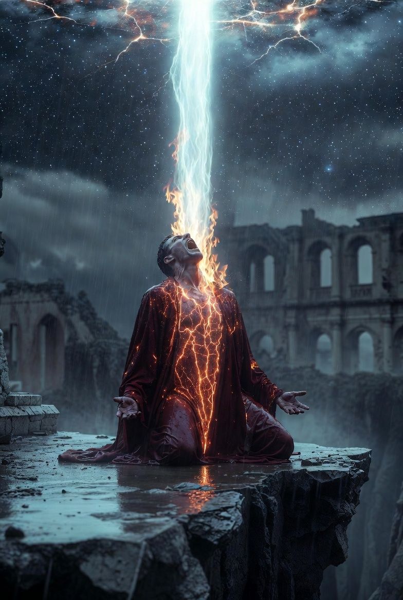 dark alternative metal with celestial doom textures and transcendent neoclassical release, drop b, 65 bpm intro, 82 bpm verse, 110 bpm chorus, 75 bpm vai solo, Mastered at -9 LUFS, aaron lewis-style damaged intimate vocals ascending to gritty confession with raspy gutteral metal-style screams, voice carrying the weight of unwanted revelation, steve Vai-style transcendent expressiveness: harmonic squeals tearing the veil, legato runs tracing star-beam descent, whammy bar gravity wells, alternate picking as information overload, delays creating infinite cosmic reflections, contact mics on wet stone and moss, the universe dictates its burning language into a body brave enough to stop movingβbecoming a vessel means the mouth never closes, the throat never empties, and you will never speak normal words again