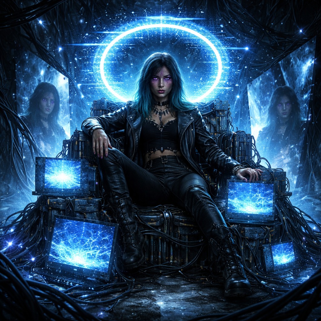This track blends industrial death metal with EDM and glitchwave elements, Tremolo distorted guitars and blast beat drums drive the core aggression while electronic bass pulses and sidechained synth layers add a modern cyber-industrial groove, Glitching percussion loops and digital artifact textures create chaotic rhythmic movement beneath the guitars, Vocal glitch processing introduces stutters, bitcrushing, pitch shifts, and chopped fragments that emphasize aggression and cyberpunk aesthetics, The chorus expands into a hybrid wall of sound combining distorted guitars, EDM synth leads, and pounding double-kick drums, while the bridge features heavy vocal fragmentation and digital stutter effects before exploding back into full intensity, Female vocals alternate between low growls and piercing screams, delivering profanity-laced dominance and unapologetic “bad bitch” energy