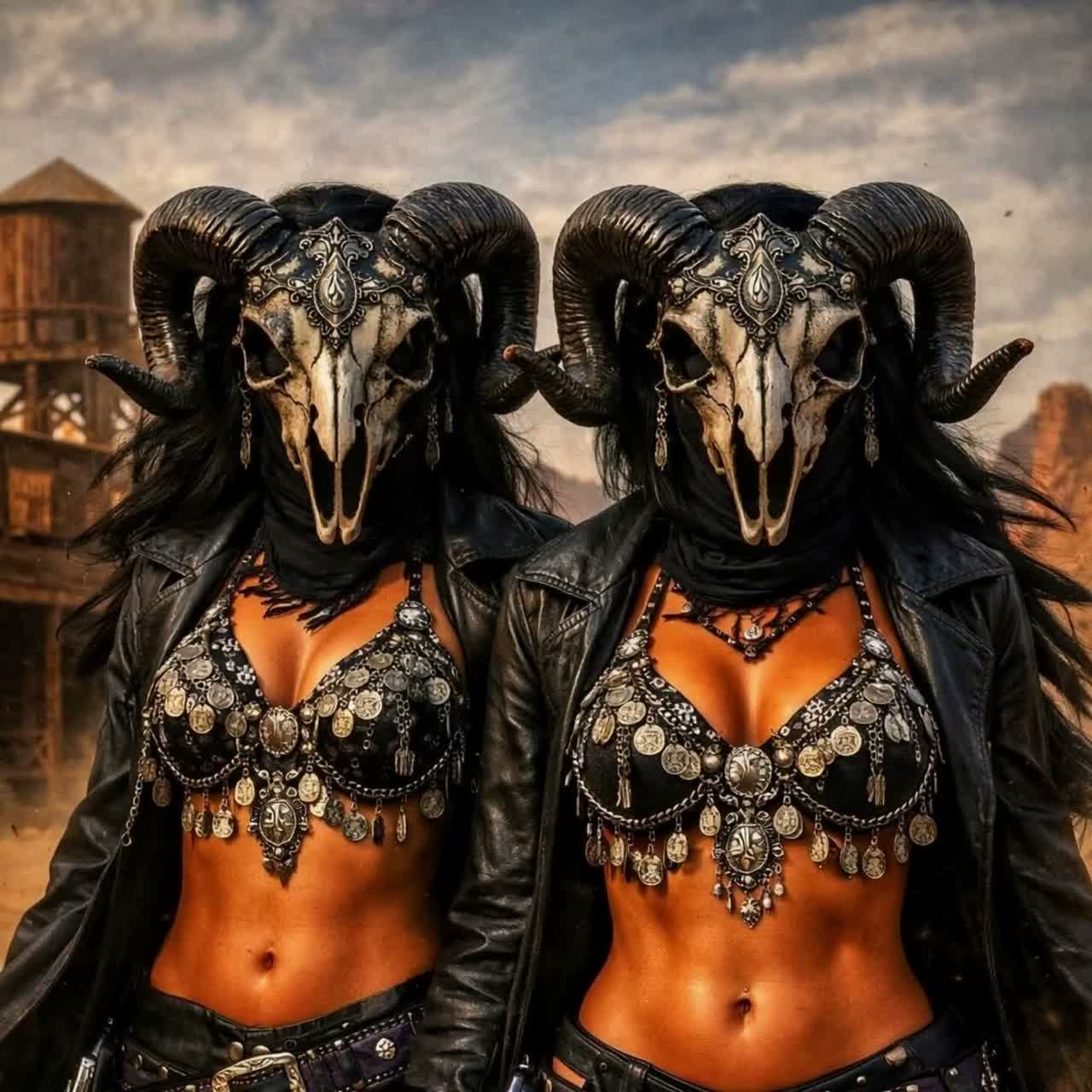 Driven by **two clear gypsy female voices**, one clear and soaring, the other rich and resonant with throat-inflected ornamentation, their harmonies intertwine, **Acoustic guitars and banjos** pluck intricate, dust-swept patterns, punctuated by metallic percussion, Dark instrumental gothic ska-punk fused with industrial EBM pulse and shadowy darkwave atmosphere, driven by offbeat skanking guitars and brooding post-punk basslines while distorted punk guitars surge in the choruses, A hypnotic electronic body beat and deep analog synth drones add mechanical intensity beneath the organic instrumentation, Continuous Appalachian banjo plucking and twanging jew’s harp weave through the rhythm like haunted folk spirits, creating a swampy ritual groove, Over this hybrid soundscape rises a powerful sound alternating with raw female throat singing chants, echoing through cavernous reverb like an ancient invocation, Horn stabs appear in minor keys with eerie melodies rather than celebratory lin
