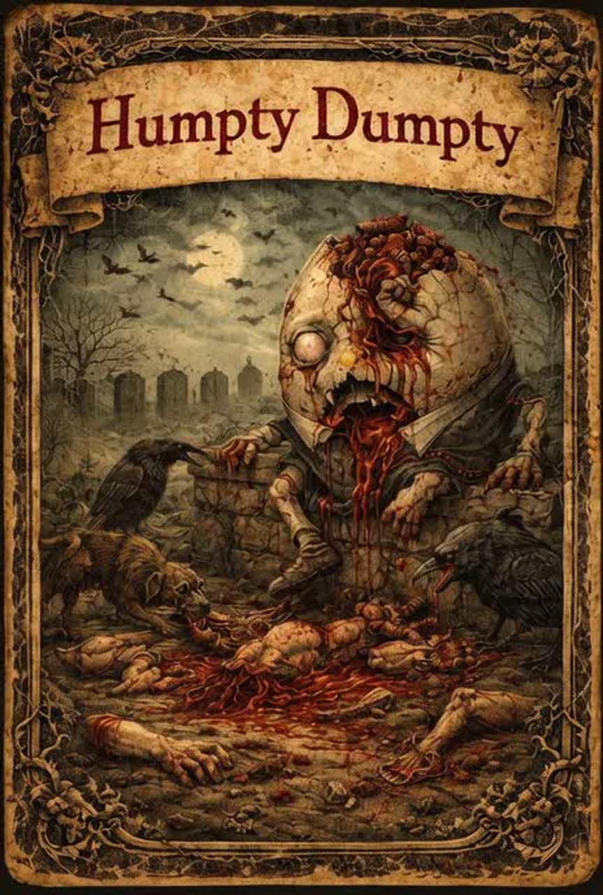 A creepy sing-song dark horror lullaby, Verses sung in a soft smooth contralto female voice with a haunting nursery-rhyme cadence, calm, hypnotic, and unsettling like a bedtime rhyme whispered in the dark, Choruses explode into female guttural deathcore growl vocals, savage and monstrous, Music blends dark rave, dark techno, dark trance, witch house, grave-wave, and lo-fi textures with deathcore and atmospheric black metal, Slow eerie intro with detuned music box melody, vinyl crackle, reversed whispers, distant bells, and ghostly children’s choir pads, After a pause a massive drop hits: distorted rave beat, deep sub bass, industrial percussion, tremolo-picked black metal guitars, blast beats, and crushing deathcore breakdowns, Alternates between eerie lullaby sections and brutal drops, Atmosphere sinister, ritualistic, dreamlike, occult, and nightmarish with huge cathedral reverb and dark cinematic ambience