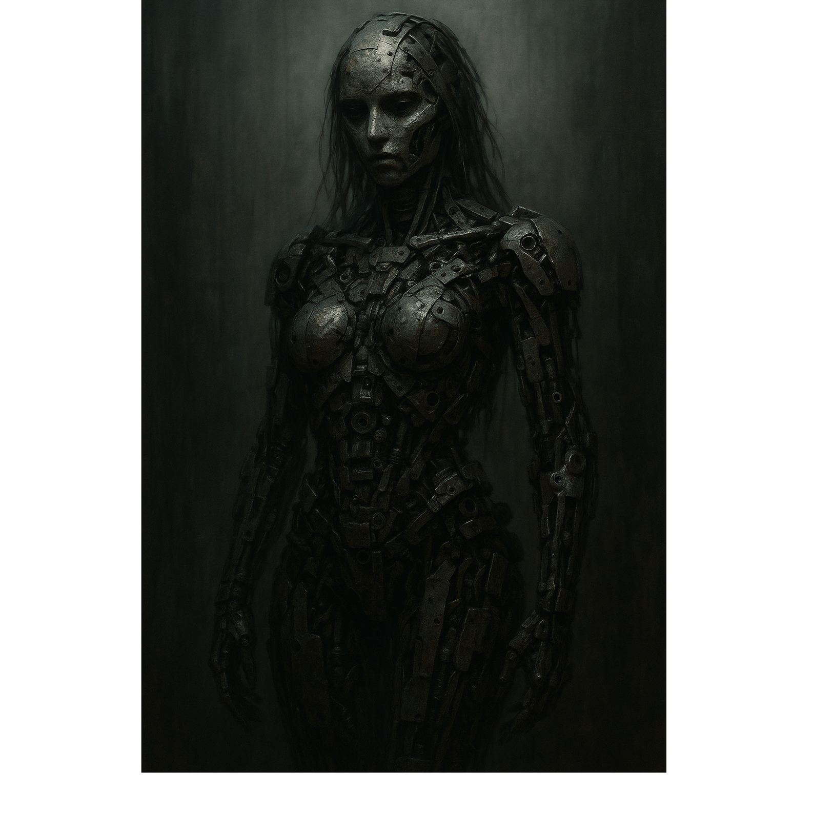 Alternative/industrial metal with dark sensual intensity, Guitars: distorted downtuned riffs with chugging accents and occasional soaring leads with delay, Electronics: metallic synth pulses, glitch textures, and cinematic drones that create a claustrophobic yet spacious mood, Bass: thick distorted low-end sidechained to the kick for a pulsing effect, Drums: hybrid industrial grooves and metalcore energy, with double-kick bursts, machine-gun snares, and syncopated patterns, Vocals: female lead alternating between husky, breathy clean singing with smoky vibrato and harsh false-cord growls or screams delivered with ritualistic force, Delivery shifts from whispered seduction to soaring belted cleans and guttural roars, punctuated by spoken passages for tension, Atmosphere: gothic, ritualistic, violent yet vulnerable, blending seduction and decay in a cinematic oppressive soundscape, ‑pop, ‑dance, ‑EDM, ‑hip hop, ‑acoustic, ‑folk, ‑lo-fi