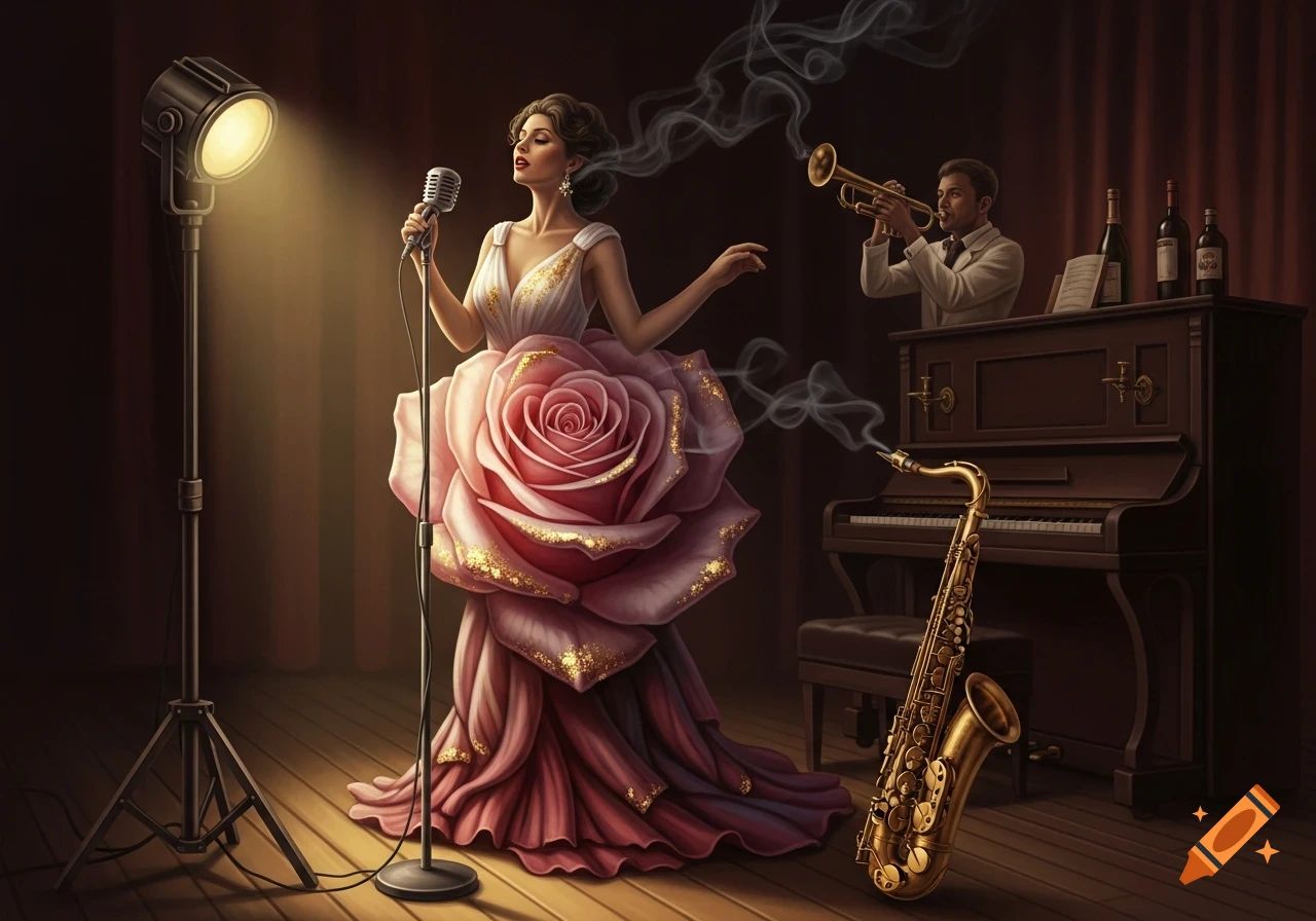 Sultry jazz-cabaret with a slow rhythm, featuring a smooth yet powerful female vocal, Intimate atmosphere with double bass, piano, and clarinet