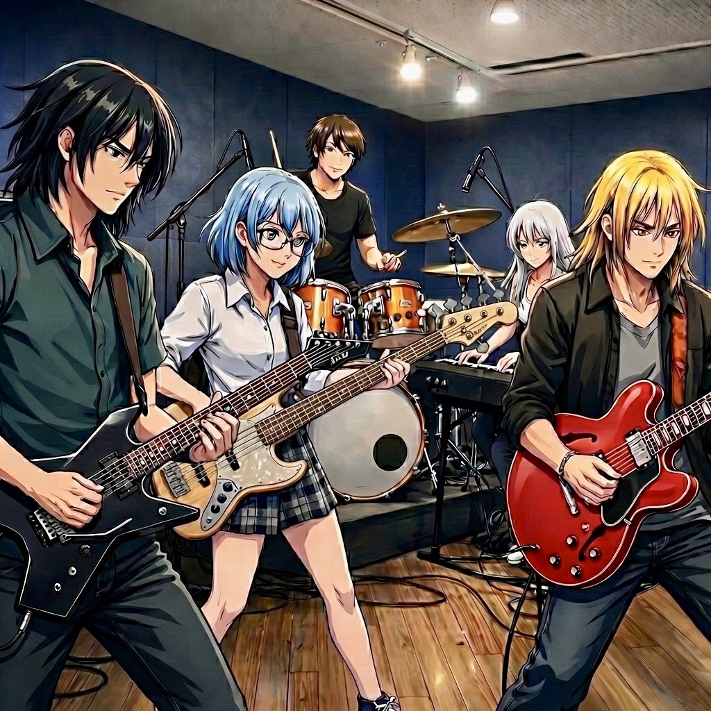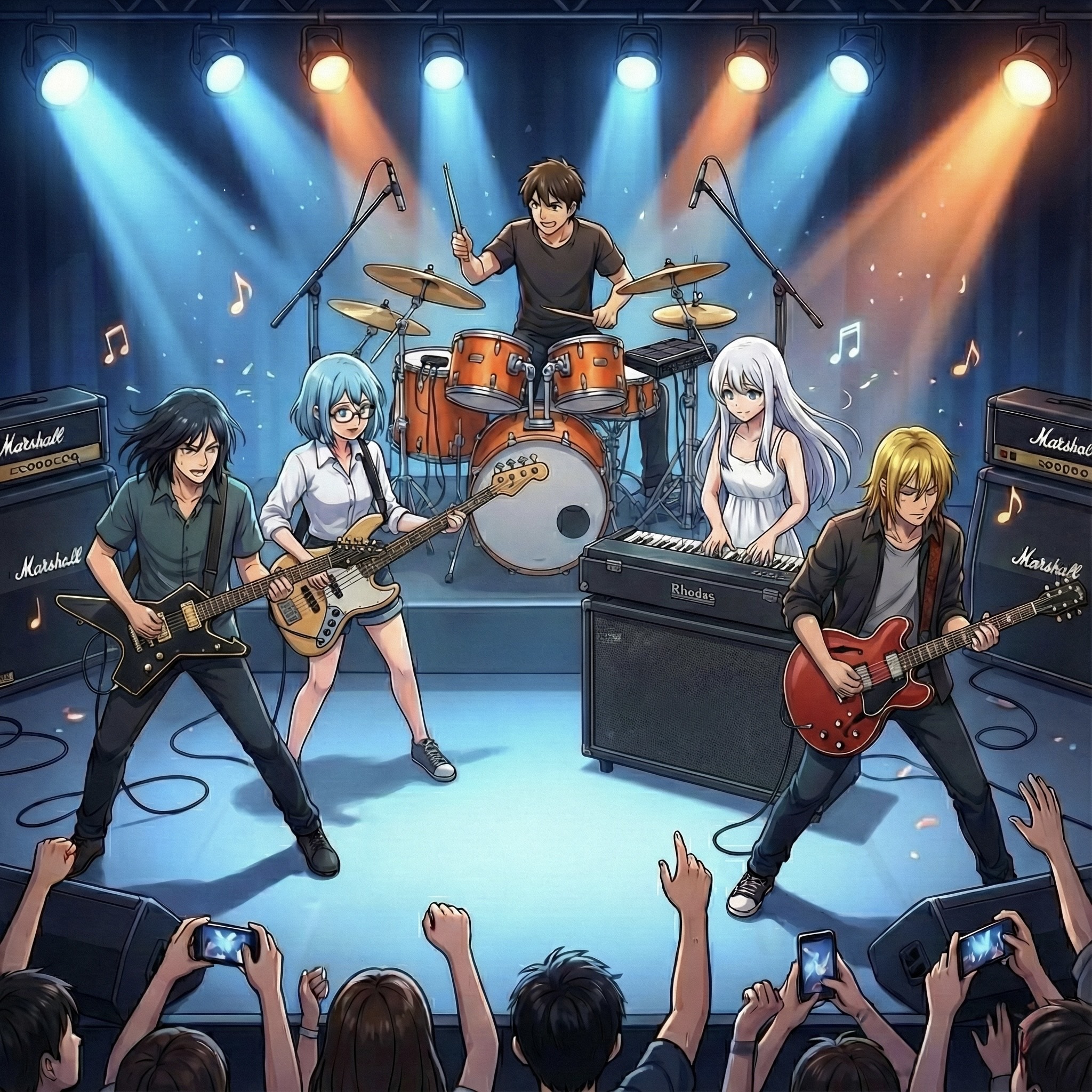 Twin guitars (Killer KG style + ES-335), jazz bass, Rhodes, hybrid drums
