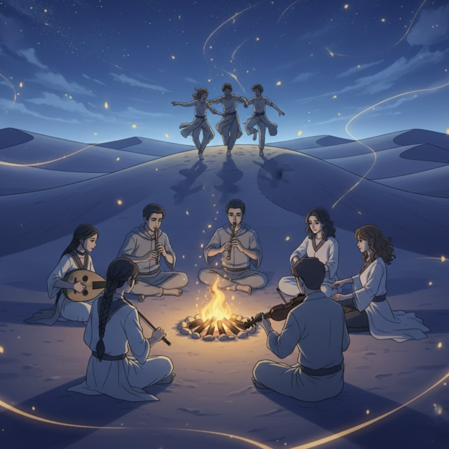 Arabian Fusion Instrumental, Maqam Hijaz + Dorian hybrid, tempo 108–120, key Dm, subtle microtuning, clean mix, high-definition sound, smooth dynamics, clear stereo image, refined fusion tone, desert-night atmosphere