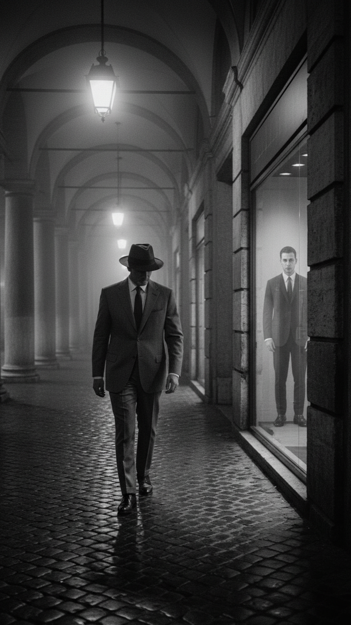An elegant and cinematic Italian pop ballad with a strong retro feel, The arrangement is built around a prominent, melancholic piano and a lush, cinematic string section that evokes 60s movie soundtracks, A groovy, melodic bassline and a tight, sophisticated drum beat provide the foundation, The vocal is a stylish, slightly detached male baritone, delivering the lyrics with a cool, narrative, and intellectual tone, The song features a distinct dynamic shift from the groovy verses to the grand, orchestral choruses, often separated by a short instrumental break