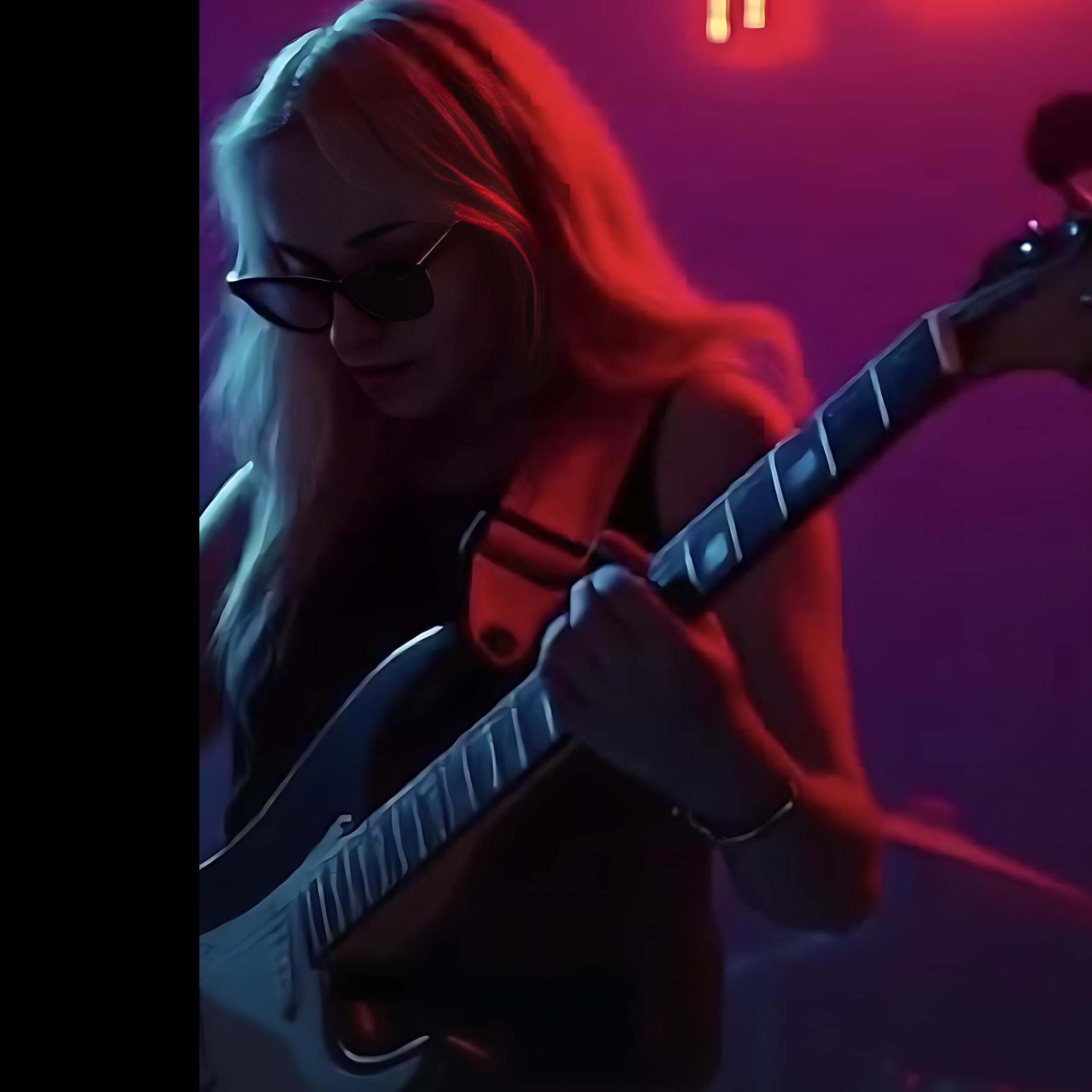 A Glam Rock, Hair Metal, late 80s energy, sexy but powerful, stage-driven rock Anthem Hot stage chemistry, neon lights, sweat and sound Confident, electric, intimate performance energy, Two musicians locked into the same moment, Vocals should be Female Strong, confident, slightly raspy Seductive but controlled delivery, Expressive phrasing, playful attitude, Optional backing vocals in chorus (“yeah”, “come on”, “feel it”), Screaming Crunchy Leadguitar in The Style Of Slash, Short, swagger-filled guitar solo, Crunchy Rhythm Guitar in The Style Of Izzy Stradlin, Prominent, grooving, Dirty bass lines (important!) in The Style Of Duff Mckagan, Bass-forward moments in verses or breakdown, Tight, punchy rock drums in The Style Of Tommy Lee, Mood & Theme : Sexy, confident, electric, intimate, powerful, rock’n’roll, stage heat, chemistry, From a woman’s point of view On-stage connection between singer and bassist, Close proximity, eye contact, shared rhythm, Music as conversation, tension