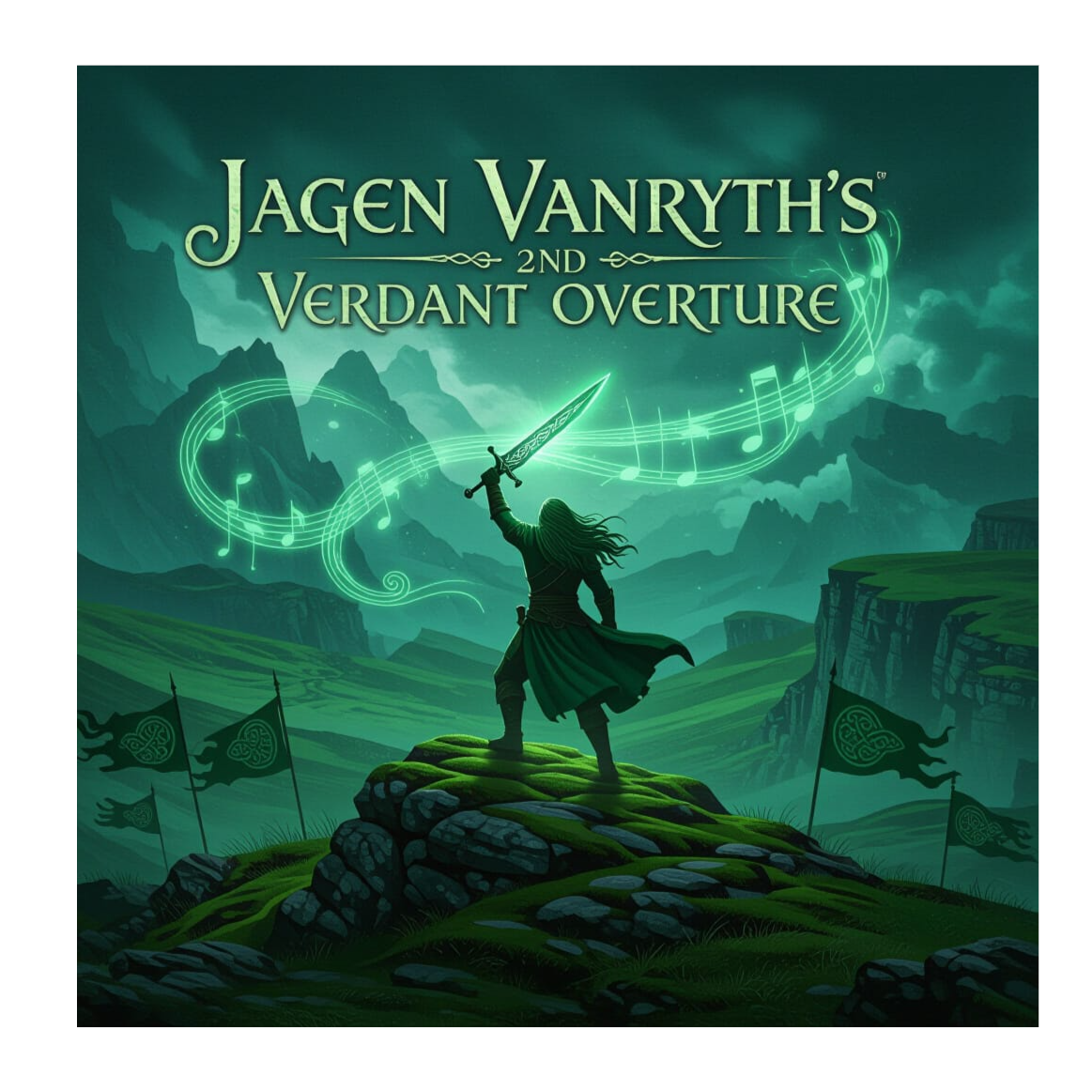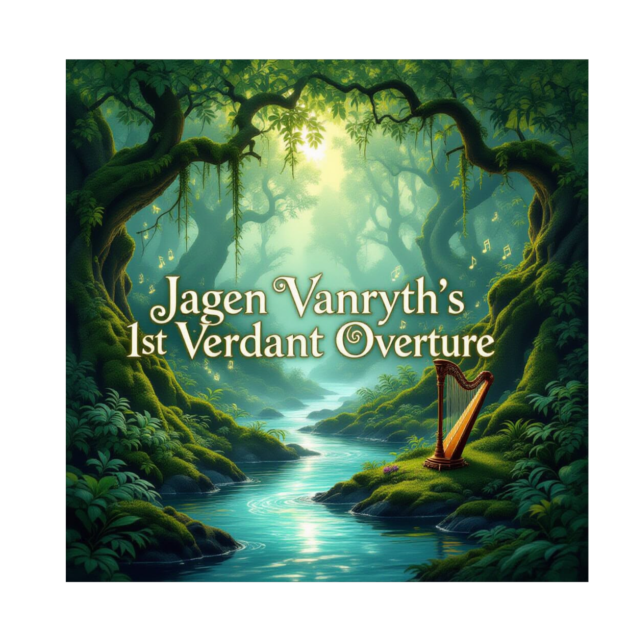 105 bpm, Celtic folk-rock fusion instrumental, blending organic acoustic textures with modern rock energy; delicate harp arpeggios interweave with distant wooden flute melodies, light bodhrán brushes, and warm acoustic guitar fingerpicking, gradually building with subtle electric guitar drones and soft bass swells; lush ambient pads underpin the soundscape to evoke the feeling of walking into a mystical emerald glade at dawn, swelling into a gentle harp flourish and fading into silence, with a balanced mix of organic warmth and rock presence for a rich, immersive sound