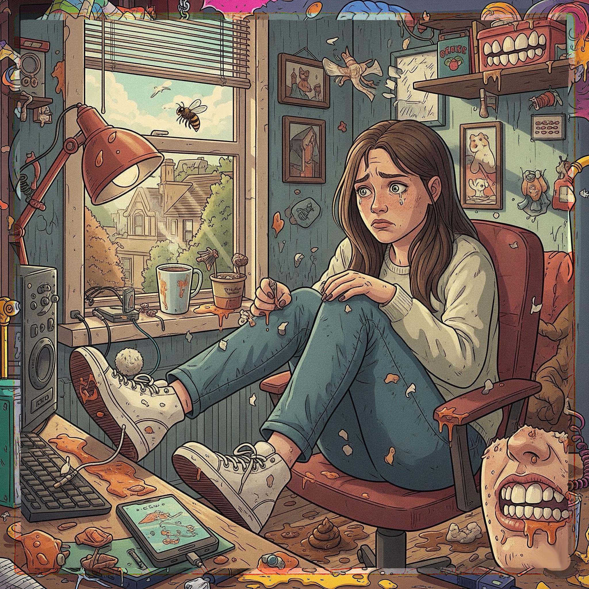A sound collage of acoustic, folktronica, fusion, indie pop, and R&B musical genres, A sound collage, a whimsical piece with staccato percussion, distorted bass lines, and experimental vocal layers, It begins with a mix of instrumental acoustic chill trance in an open dynamic evolution between genres: plucked arpeggios that outline the chord shapes, using alternating bass techniques and subtle hammer-ons/pulls for ornamentation, The lead vocal is intended to be slightly nasal, expressive, It utilizes shifting dynamics, The middle section shifts to fusion with quick flashes between trumpets and percussion, and counter-singing in the choruses with short, slightly distorted electric guitar notes, In the final section: rhythmic thumb strokes on the low string, with layered polyphonics, Slides, particular harmonics around the high E (12th-15th fret), Emotional phrasing, dynamic crescendos of indie pop and R&B