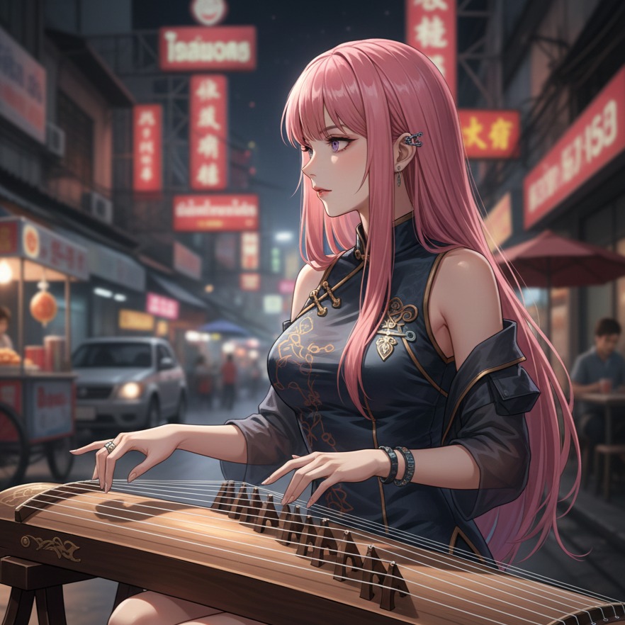 Ultra close-mic Thai-Isan female lead vocals, whisper-pop tone, playful phrasing, guzheng textures, High-energy ThaiIsan-Chinese folk-dance / Mor-Lam-Sing rock fusion track at 160 BPM, 4/4, featuring fast, rhythmic lead violin with traditional Isan ornamentation, saw-style phrasing, and guzheng-inspired melodic shapes, Bright acoustic guitar strumming, deep double bass, crisp snare with light percussion, plus distorted electric guitar riffs with power chords and palm-muted chugs for rock edge, Prominent Phin or synth lead delivers a bright, twangy pentatonic hook blending Isan and Chinese scales, Ultra close-mic Thai-Isan female whisper-pop vocals with Isan speech bounce, playful London-accented English, and tasteful R&B runs over guzheng textures, alongside powerful, gritty male vocals with wide vibrato in a mid-to-high tenor range, Clean yet punchy production with natural room and chamber reverb, wide stereo field, heavy drum compression, t, girl voice, ‑Upbeat folk dance track, ‑Alternative Rock, ‑Heavy Guzheng (Chinese zither) riffs, ‑distorted electric guitar, ‑driving drums, ‑90% Mandarin 10% English, ‑G Major, ‑130 BPM, ‑playful, ‑confident, ‑Muay Inter rock star energy