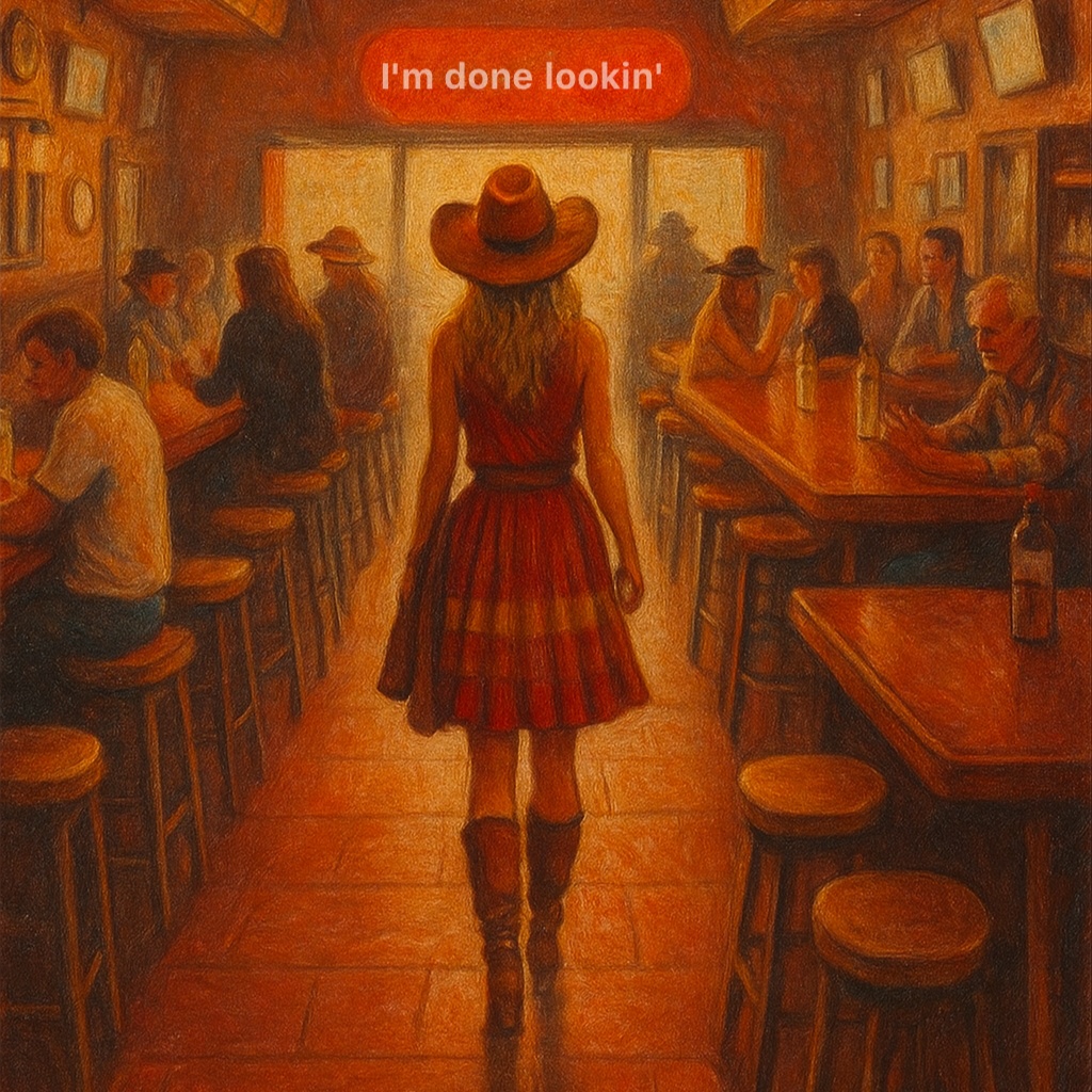 Hard-driving honky tonk kicks off with blazing twangy lead guitar, upright slap bass, and punchy drums locked into a stomping backbeat, Piano and occasional fiddle add spicy fills, Female vocals deliver sassy, bold lines with swagger, mixing spoken and sung parts, Every chorus pops, boosting the rowdy swing as the band stays tight, lively, and dancefloor-ready, The mix leaves room for comic delivery and powerhouse vocals, turning every line into playful, barroom storytelling, ‑Ballad