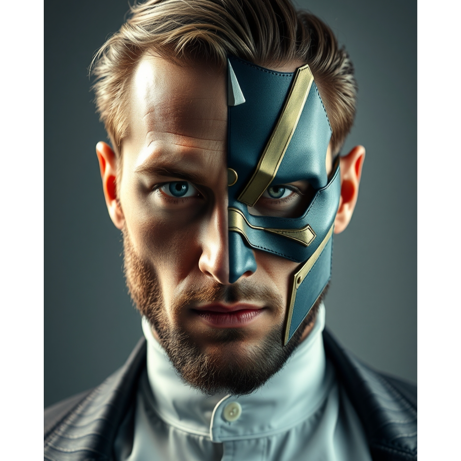 A bold, theatrical 80s-inspired synth-pop and dark new wave fusion, with an edgy, detached male vocal style—laconic, controlled, and ironic, Production blends shimmering synths, punchy bass, crisp drums, creating a sleek nightlife atmosphere, Verses intimate, whispered conspiratorial; pre-chorus shouted, mocking; choruses theatrical and dynamic with catchy hooks, Arrangement alternates sparse tension and lush synth layers, embodying themes of identity, illusion, and performance, Mood is provocative, stylish, enigmatic—a sonic masquerade balancing cool detachment with sharp theatricality and brief shouted bursts, ‑ballad, ‑soul, ‑romantic, ‑singer-songwriter, ‑folk, ‑torch song, ‑soft rock, ‑adult contemporary
