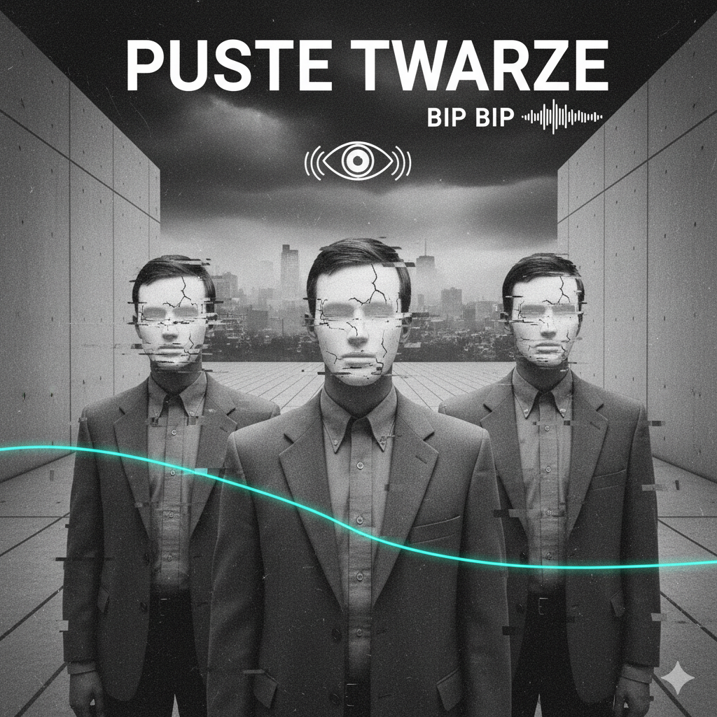 Create a raw, melancholic, and intellectually rebellious New Wave / Rock track, strongly influenced by 80s Polish rock (e, g, Republika, Maanam, Tilt), focusing on themes of conformity, media manipulation, and hidden dissent, The music should feel both cold and driving, with moments of atmospheric introspection and powerful, anthemic choruses, Instrumentation features a prominent, cold, clean electric guitar playing sharp, repeating, slightly dissonant riffs that evolve into distorted power chords, A driving, simple bassline provides a solid foundation, Drums are sparse, reverbed 80s-style drum machine beats or real drums with 80s processing (snare-heavy), Analog synths create atmospheric pads and cold, bright melodies, The lead vocal is a male voice, often detached, monotone, or melancholic, evolving into urgent and powerful in choruses, sometimes supported by raw, chant-like male backing vocals, Incorporate subtle electronic 'Bip' sounds and distorted clips to emphasize themes of int