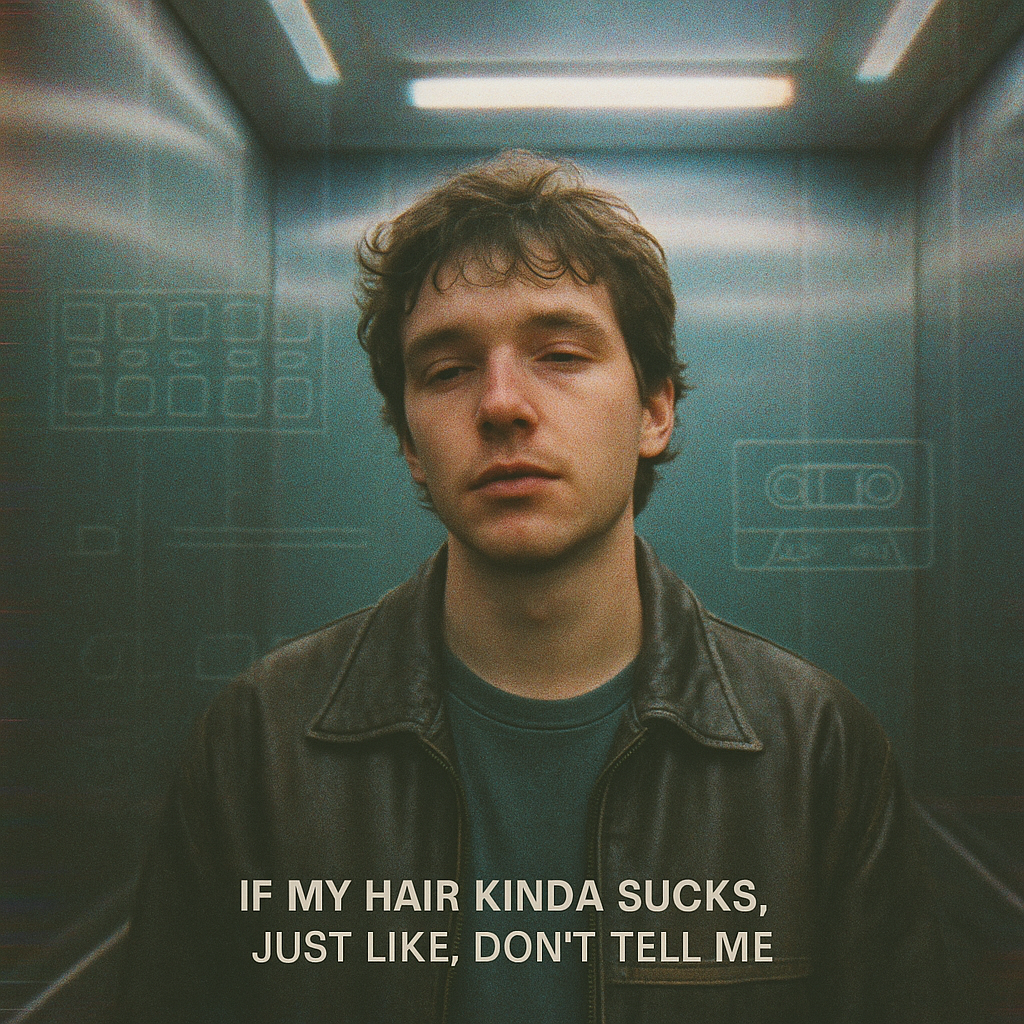 Indie art-pop meets lo-fi hip-hop and emo rap, layered with dreamy synths, detuned guitars, warm analog textures, retro drum machines, and warped tape effects, Emotional yet quirky tone, with melodic hooks and whispered rap delivery, Vulnerable, surreal, and subtly psychedelic