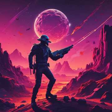 A fast paced high-energy space western outlaw song with energetic drive, fast tempo with a steady, propulsive rhythm stomping kick, Classic western elements like acoustic guitar riffs, slide guitar, gritty bass and punchy drums are combined with sci-fi space rock textures, pulsing synths and electronic synthesizer accents, The mood is confident, dangerous and cinematic, telling the story of a famous and infamous bounty hunter outmaneuvering space pirates in ship combat and gunfights, Vocals are a deep, gritty, smoky male voice with attitude and swagger, delivering lyrics with clarity, bite and controlled aggression, The song should feel like a chase through asteroid fields, a barroom legend told at hyperspeed, and a professional killer who treats bounty hunting as hard work — a brutal but necessary counterbalance to hauling cargo through the stars