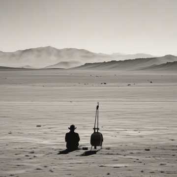 A slow, extremely tense and atmospheric western soundtrack piece with no drums and no percussion of any kind, The arrangement is minimal and spacious, built on silence, pauses, and sustained tones, Lead instruments are harmonica playing sparse, haunting phrases, a distant whistling melody, and single, dry electric guitar notes with heavy reverb and long decay, Occasional tremolo guitar swells and subtle volume fades create a sense of breathing tension, A PROMINENT wide deep synth pad sits layered in the background, adding depth and a feeling of vast emptiness without sounding modern or rhythmic, The music should feel like a high-noon duel frozen in time, where every second stretches and the smallest movement could be fatal, The track should slowly build psychological pressure and end unresolved, fading into silence, Vocals are a low, restrained, gritty male voice, verses spoken with minimalism and weight, leaving lots of space between lines, Chorus vocals are dramatic and emotional, ‑drums, ‑drumkit, ‑percussion, ‑drums, ‑rythmt, ‑beat, ‑groove, ‑rock'n'roll