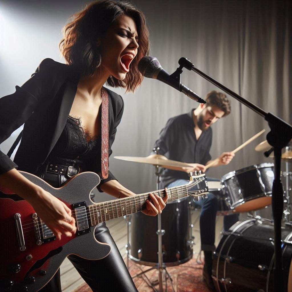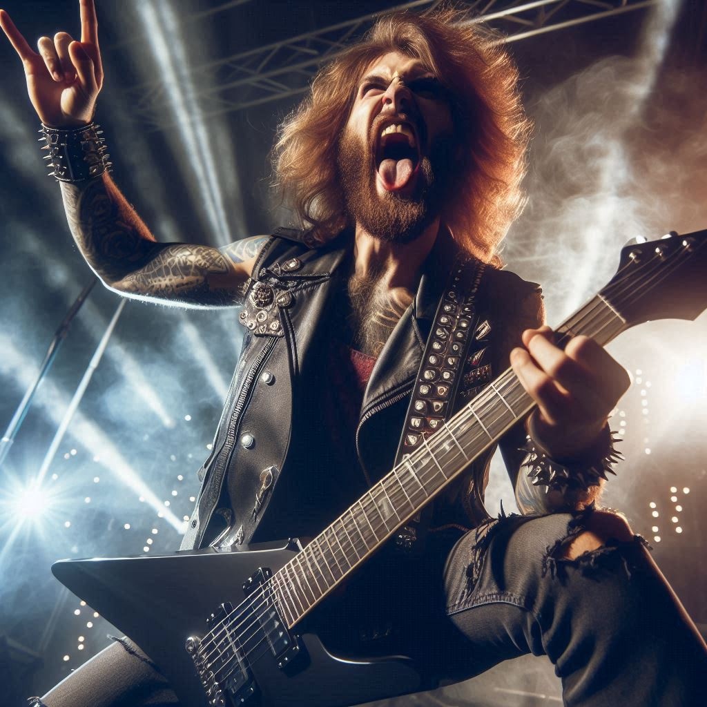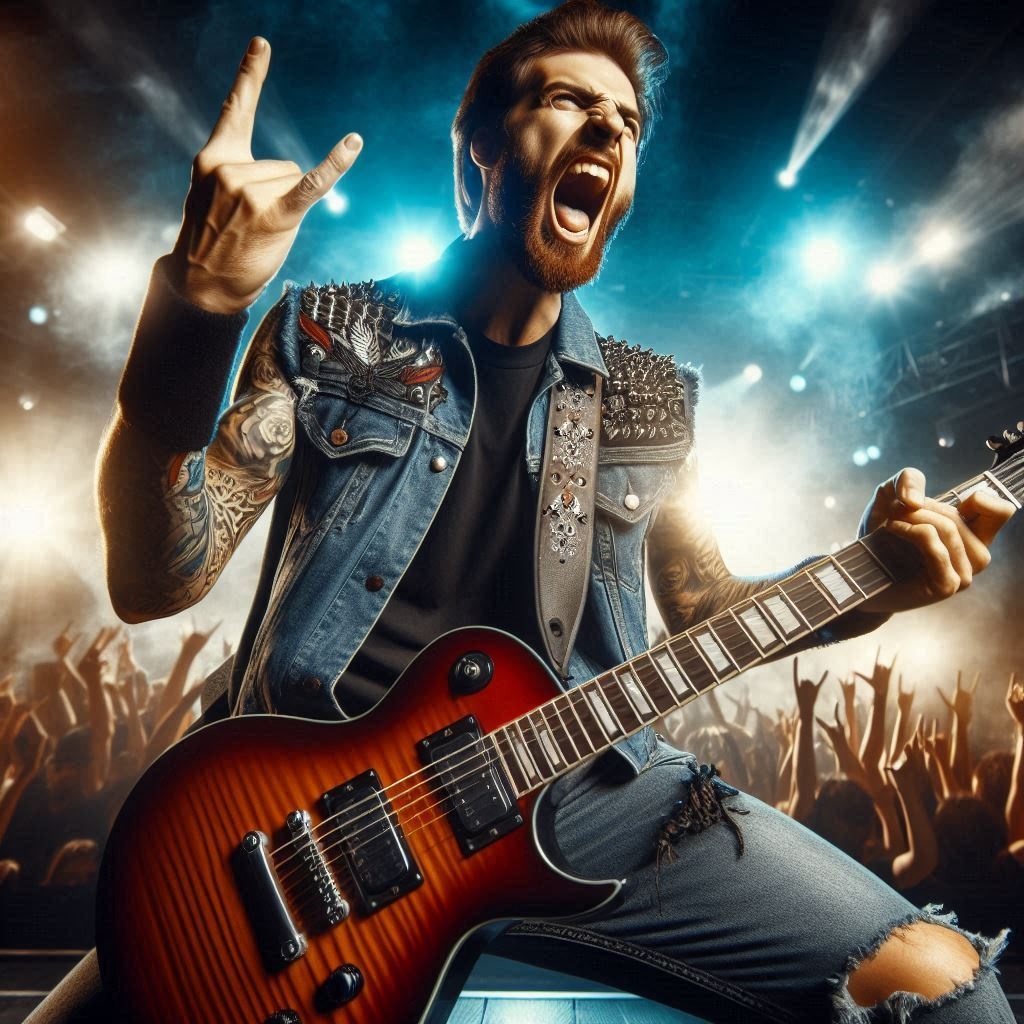 Rock concert, rock theatre music, raspy roaring male vocal, audience singing with the performer, virtuoso rock guitar solo, virtuoso rock fast elemental drums solo, hall of fame, slow metal