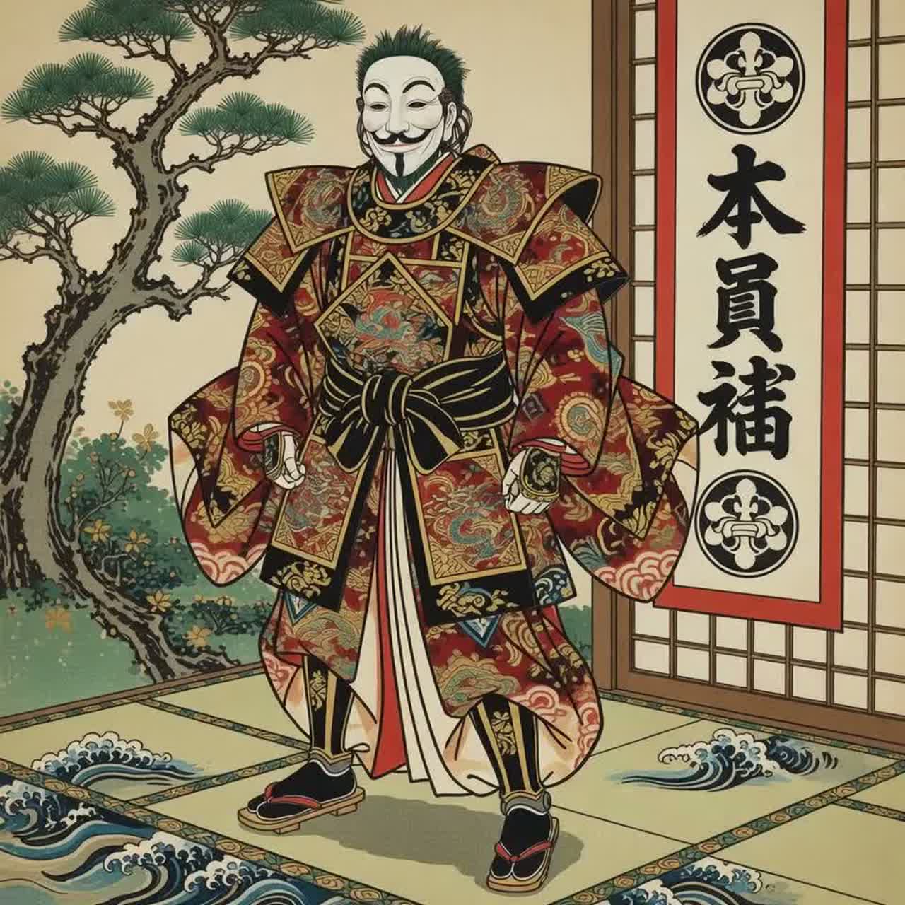 eurobeat, speedcore, electro house, gagaku motifs, kabuki accents, taiko breaks, distorted synth stabs, FM bassline, cutup arpeggios, sidechain pumping, crisp limiter drive, wide stereo synths, call response chants, double time drums, 178 BPM, half time drop, explosive climax, festival anthem, ‑female vocals