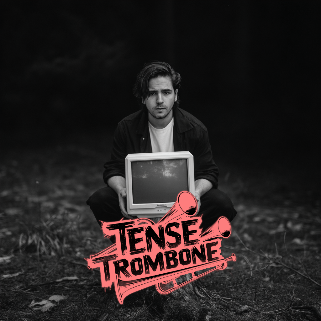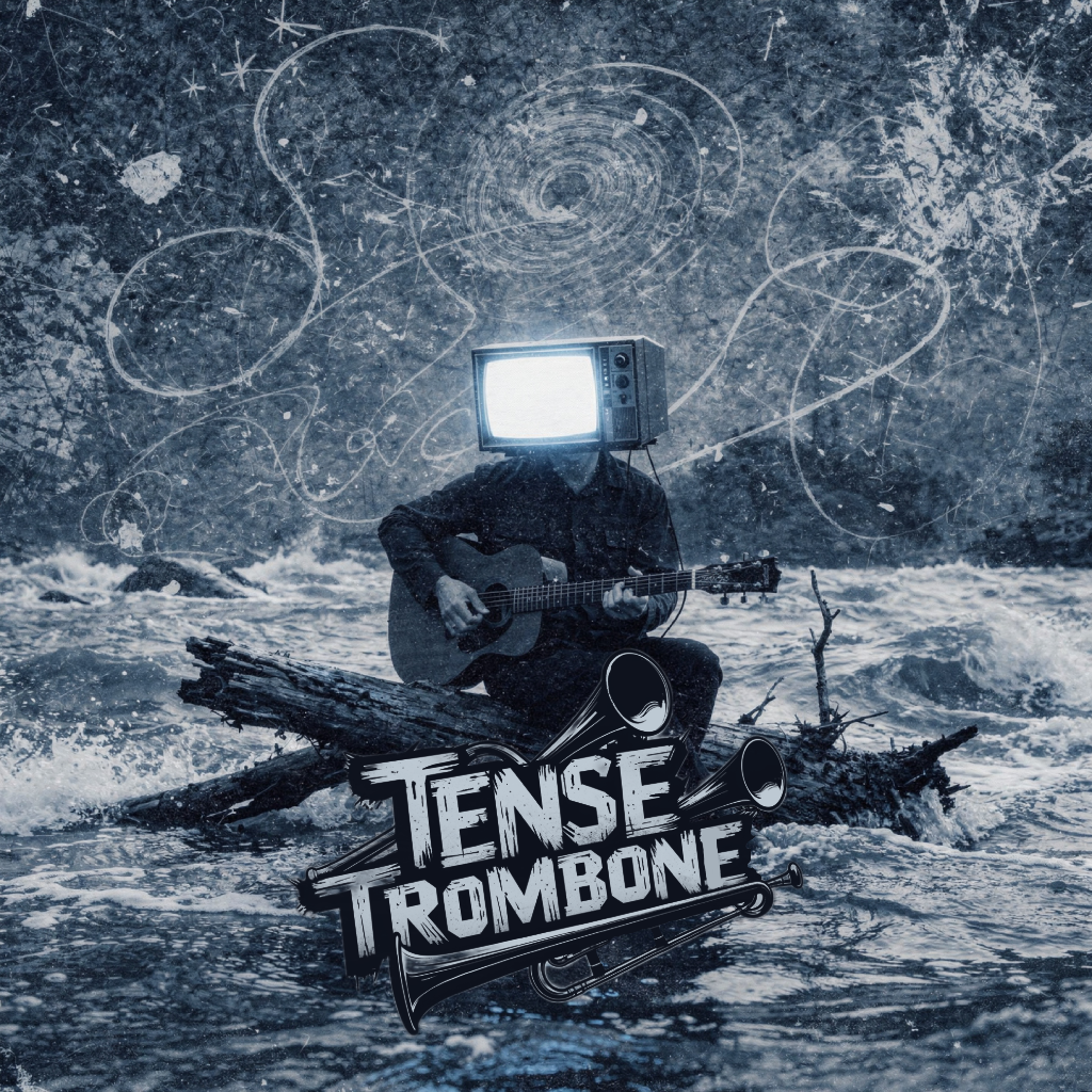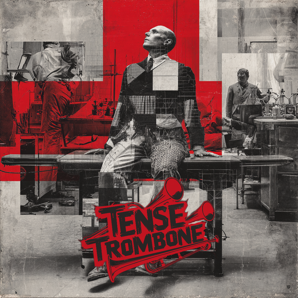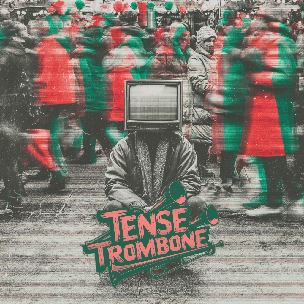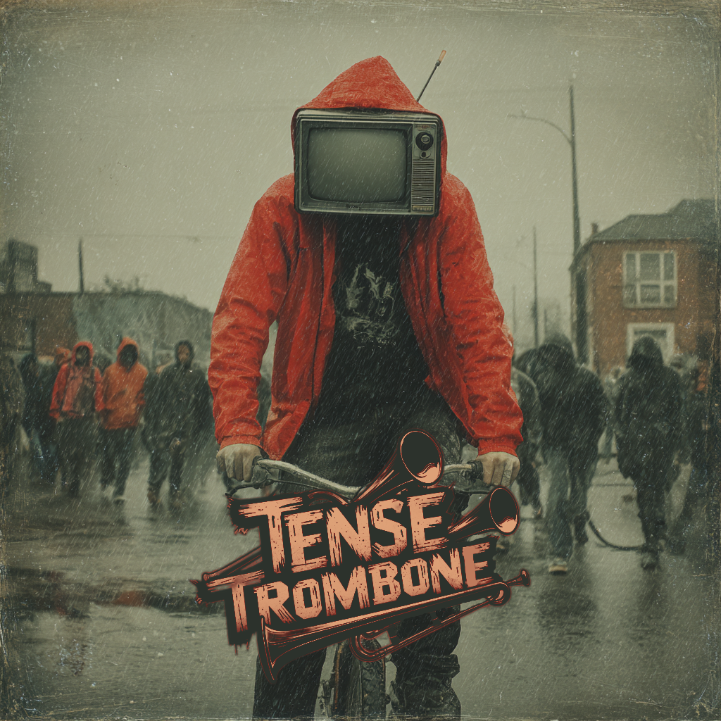 Crisp high fidelity studio production, Crisp vocals, and crisp high fidelity instrumentation, A post-punk revival, experimental indietronica track featuring punchy, angular guitars alongside skittering synth textures, Acoustic punk folk hooks interject, adding quirky contrast to soaring, reverb-laden trombone riffs, The rhythm section constantly shifts—syncopated basslines and driving, evolving percussion fuel the song’s momentum, while melancholic, dynamic male vocals cut through with bittersweet, ironic clarity