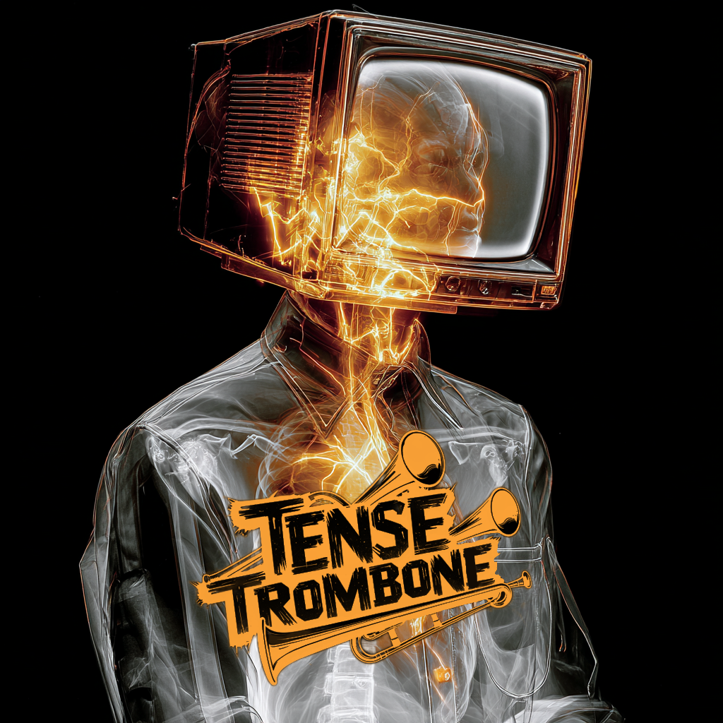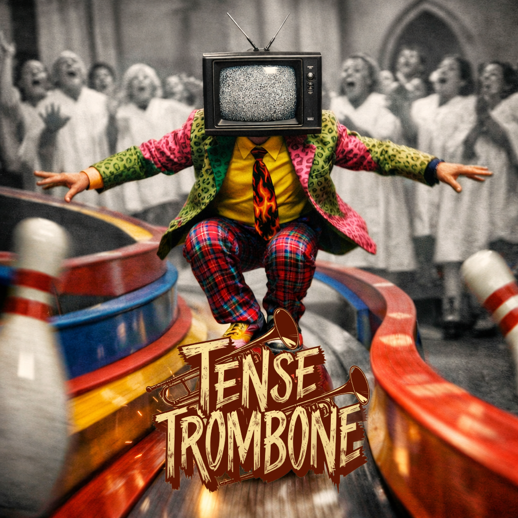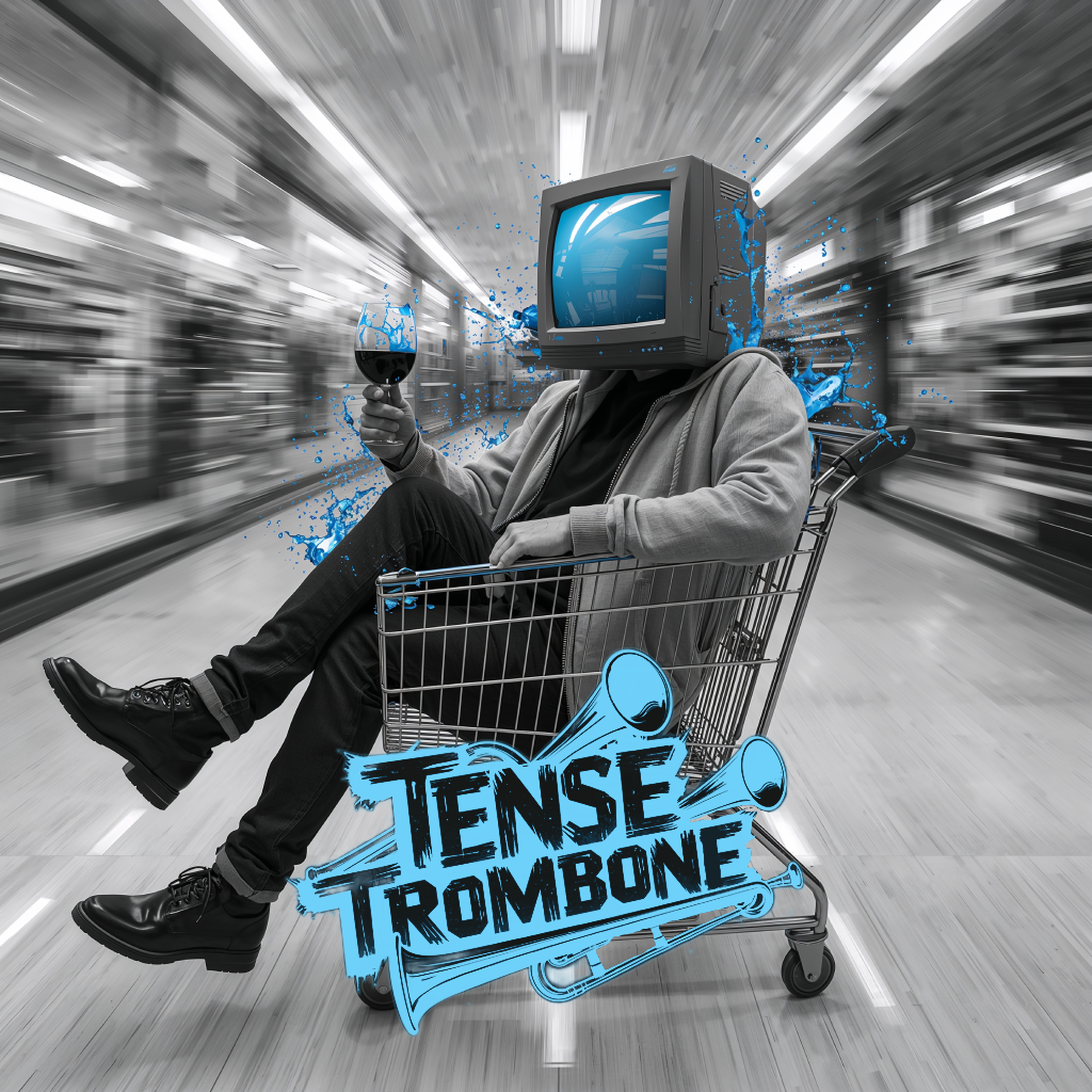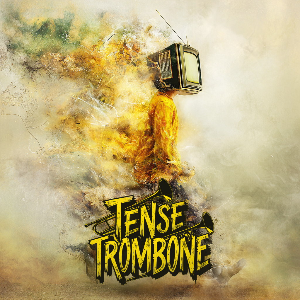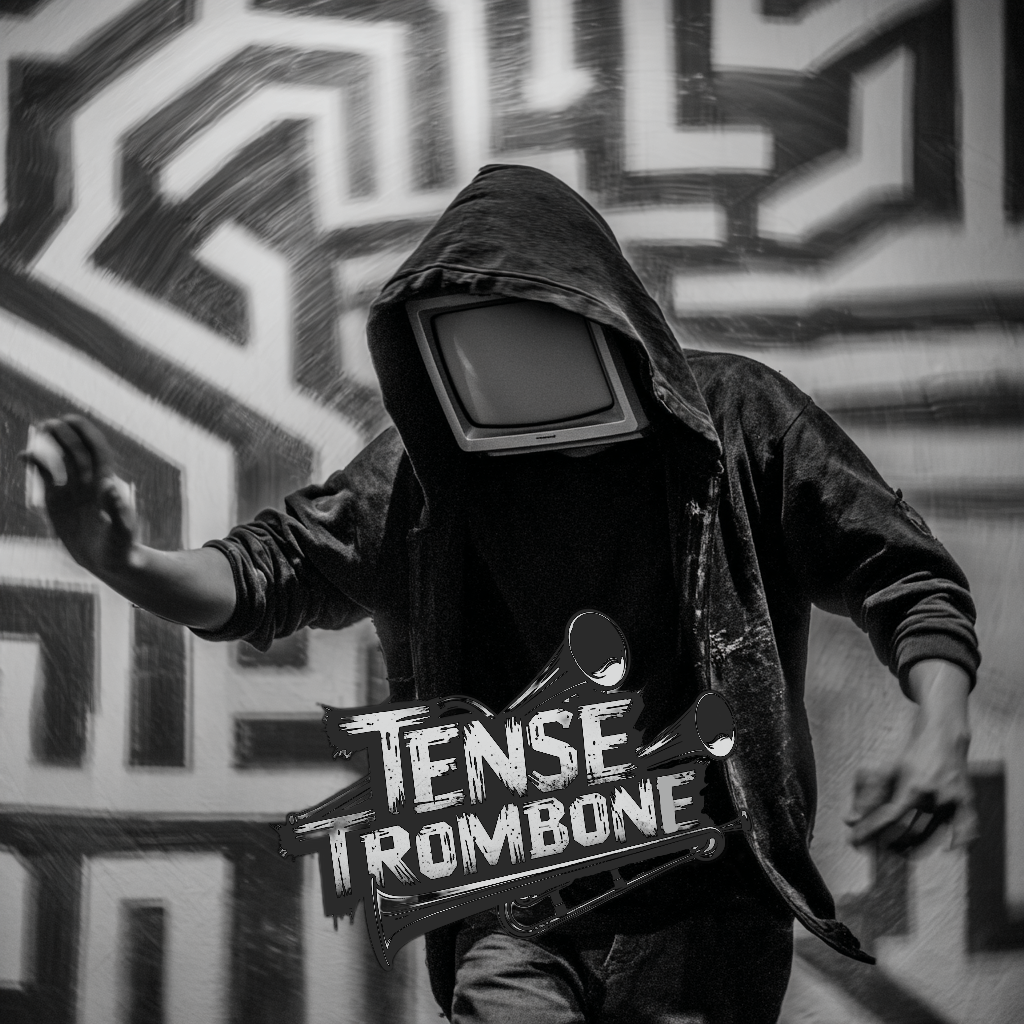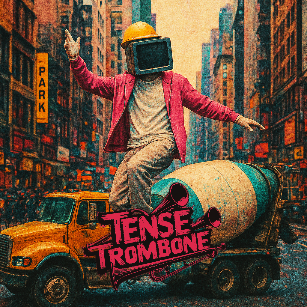 Crisp high fidelity studio production, Crisp vocals, and crisp high fidelity instrumentation, A post-punk revival, experimental indietronica track featuring punchy, angular guitars alongside skittering synth textures, Acoustic punk folk hooks interject, adding quirky contrast to soaring, reverb-laden trombone riffs, The rhythm section constantly shifts—syncopated basslines and driving, evolving percussion fuel the song’s momentum, while melancholic, dynamic male vocals cut through with bittersweet, ironic clarity