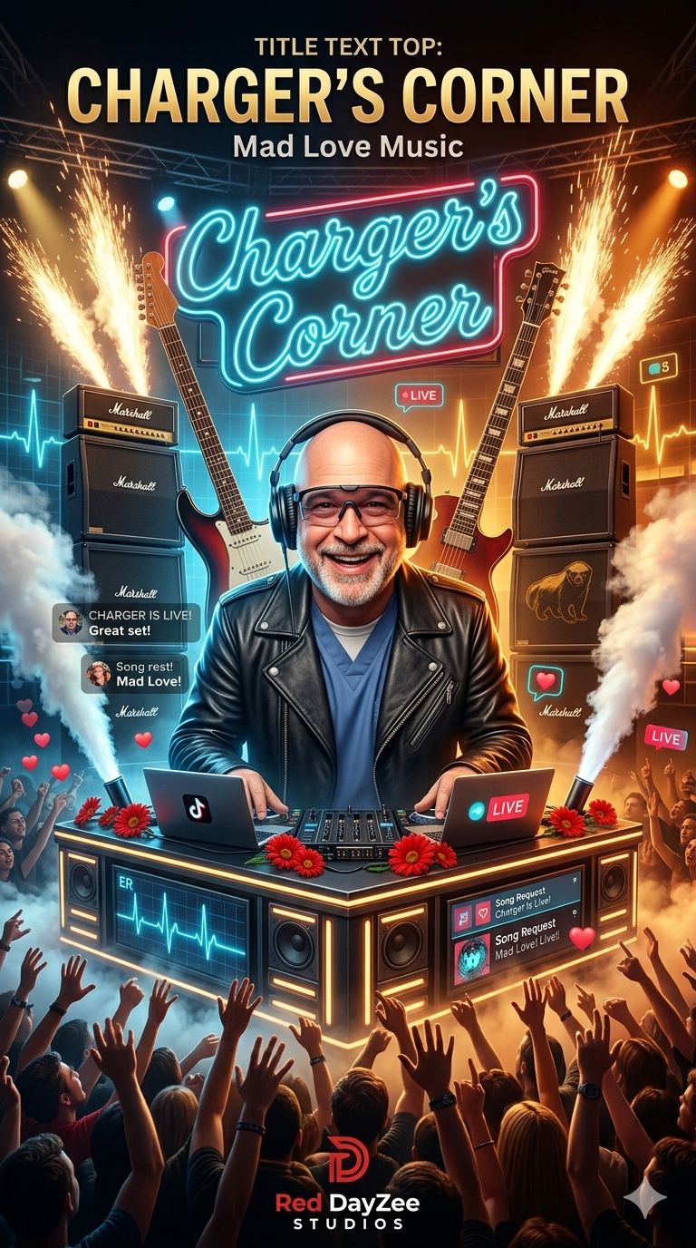 “Charger’s Corner (Classic Rock Intro)” is a one-minute arena-ready hype anthem built for TikTok LIVE entrances, Inspired by charger1088 — nurse veteran, DJ host, song-request king, and trusted commentator — this version swaps hip-hop for roaring classic rock power, The track opens with thunder, guitar feedback, and stomping drums before exploding into a chant-ready chorus, Driving electric guitars, crowd-clap percussion, bass-heavy momentum, and big-room vocals create a sports-arena energy perfect for opening streams, Lyrics reference his 18 years in healthcare through ER, trauma, and psych, showing toughness with compassion, It also nods to the real moment Honey Badger invited the user into his room and Charger played the user’s song live, helping reignite momentum, Built for LIVE intros, audience hype, replay loops, and making the room feel like main-event time