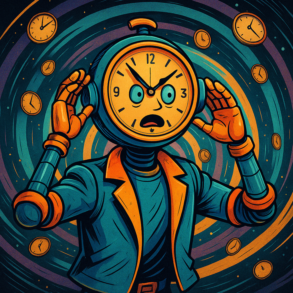 A humorous yet emotionally charged synthpop track blending bright 1980s-inspired analog synths, shimmering pads, and bouncy basslines, The tone walks the line between satire and sincerity—retro-futuristic in sound design with tongue-in-cheek lyrical delivery, Vocals should feel expressive and slightly theatrical, as if narrating time’s emotional rollercoaster, Production should evoke neon nostalgia, clockwork sound effects, and rhythmic motion that mirrors time’s uneven pace, The overall feel is witty, bittersweet, and full of charm, ‑Hard Rock, ‑Heavy Metal, ‑Country, ‑Jazz Fusion, ‑Orchestral