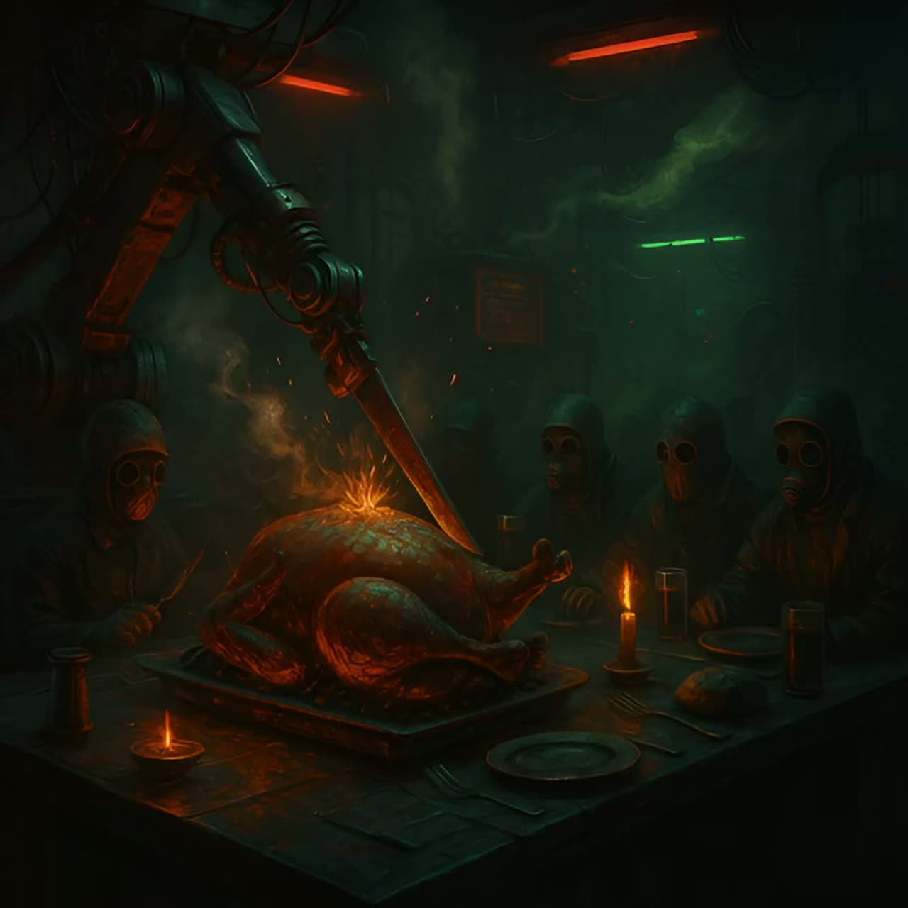 This song fuses distorted guitar loops, pounding mechanical drums, and vocoder-infused chants into a brutal industrial anthem, Blending satire and dread, the track stomps forward with militaristic swagger and dystopian flair, Cold synth drones, glitch breaks, and shouted call-and-response choruses create a hypnotic rhythm of synthetic feast and revolt, German phrases slice through the noise like commands, while spoken word verses evoke a cold steel holiday, Perfect for lovers of post-industrial sarcasm and stomping factory-floor rebellion, ‑folk, ‑acoustic, ‑country, ‑indie pop, ‑dream pop, ‑orchestral, ‑lo-fi, ‑jazz, ‑ambient, ‑synthwave, ‑funk, ‑retro pop