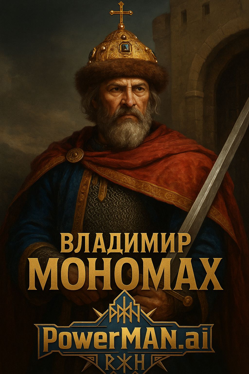 Epic symphonic rock ballad about Vladimir Monomakh, ruler of Kievan Rus, Style: symphonic rock / symphonic metal ballad, Tempo: slow to mid-tempo, cinematic build, Mood: solemn, noble, historical, monumental, Male lead vocal, deep and authoritative, Large mixed choir (male and female), Prominent Russian Orthodox church bells (bell chimes) used as recurring motif, especially in intro, bridge, and outro, Full orchestra: strings, brass, choir, with powerful rock drums and electric guitars, Atmosphere of law, moral strength, responsibility of power, unity of Rus, Language: Russian, Length: 7–8 minutes, No modern elements, Epic historical feeling