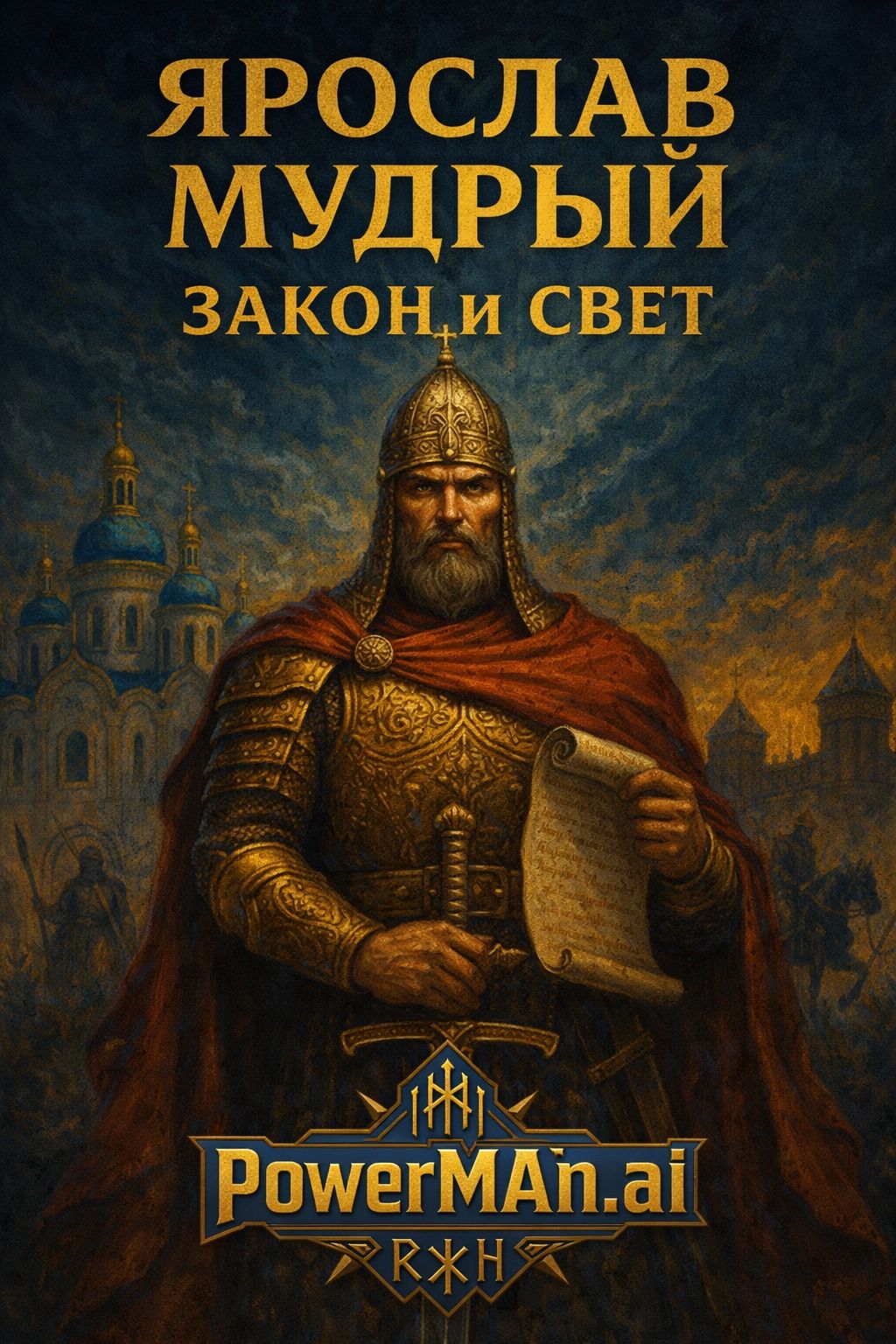 Epic symphonic metal ballad about Yaroslav the Wise and the creation of Russkaya Pravda, Slow to mid-tempo, 7–8 minutes, Dark, monumental, solemn atmosphere of Ancient Rus’, Male lead vocal baritone for narrative verses, female soprano for lyrical pre-choruses, large mixed choir for epic choruses, Wide orchestral arrangements, heavy guitars, deep bass, powerful drums, choir-driven climaxes, long instrumental passages between vocal sections, Theme: law above violence, wisdom stronger than war, justice instead of blood feud, state built on word and law, Emotion: dignity, strength through wisdom, historical inevitability, sacred legacy, Structure includes long orchestral and choral instrumentals, slow build-ups, dramatic breakdowns, and a massive final chorus, Language: Russian