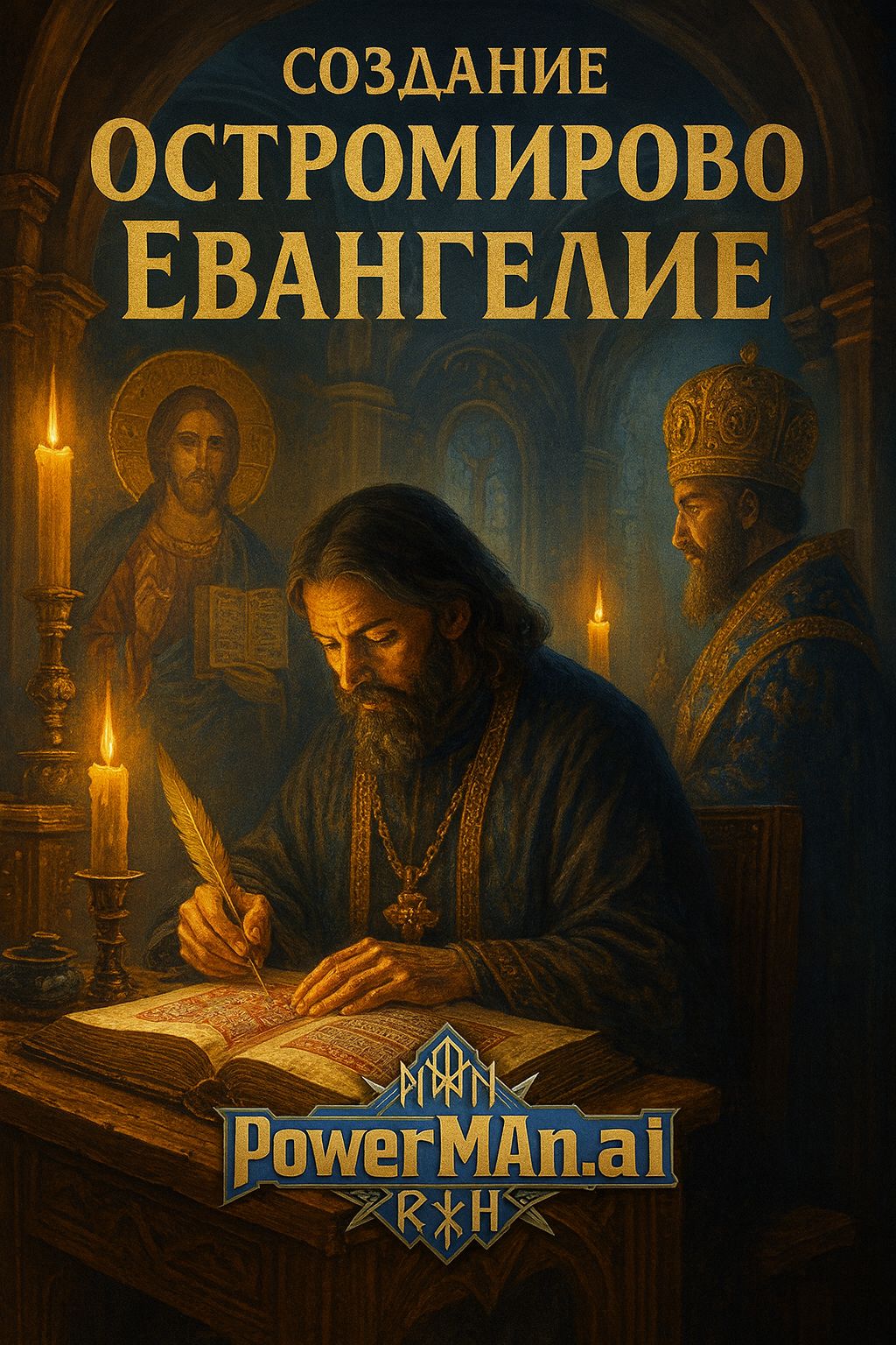 Create a symphonic rock song in the style of Orthodox Christian music, Use Russian lyrics, The song is about the creation of the Ostromir Gospel, the oldest dated book of Rus, from 1056–1057, Follow this structure exactly with square brackets to indicate sections, Alternate between male and female choirs according to the labels, Do not include any musical instrument instructions, Keep the atmosphere majestic, sacred, and epic